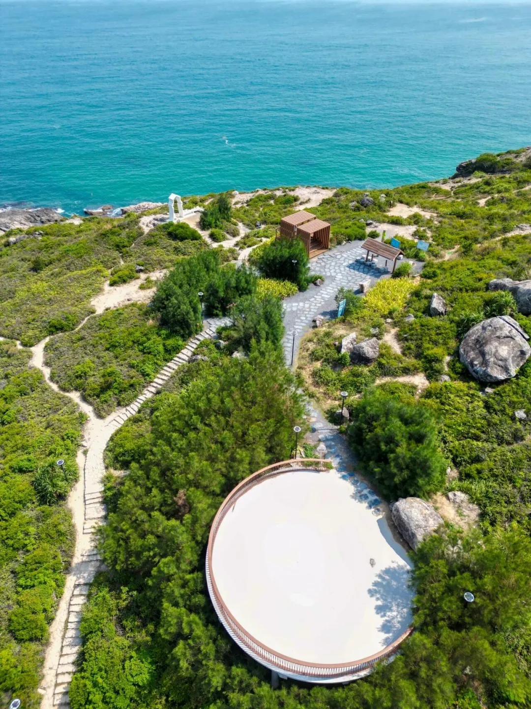 背倚苍翠叠嶂的大鹏群山,面朝万顷蔚蓝南海,白色天文台穹顶立于崖顶,与云天碧海相映成画。悬崖盘山栈道如天梯垂落,一侧是陡峭青绿山岩,一侧是无垠澄澈海面,顺着山势蜿蜒入海。
