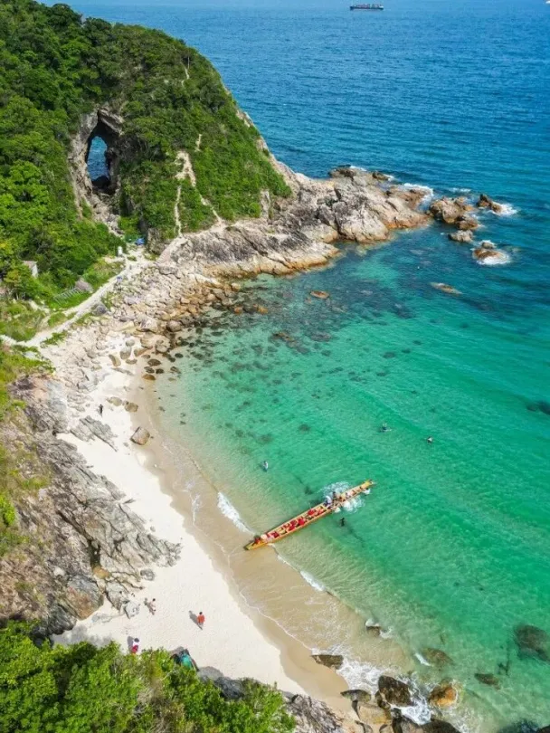 藏在东涌沙滩的穿鼻洞,十多米高的海蚀奇洞如大地之门,洞外潮声奔涌,洞内藏着另一重静谧大海,一步一景,皆是自然鬼斧神工。