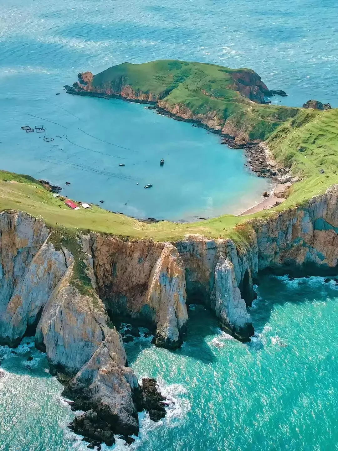 阳光从东边升起,光线不断漫到岛上,漫山草甸褪去枯黄,铺成无边绿毯,从崖顶一直垂到海边。风过处,草浪轻涌,极致的蓝与青草的绿不断碰撞,而半弧状的岛屿又像极一座天然的海上潟湖,山环海抱,自成天地。