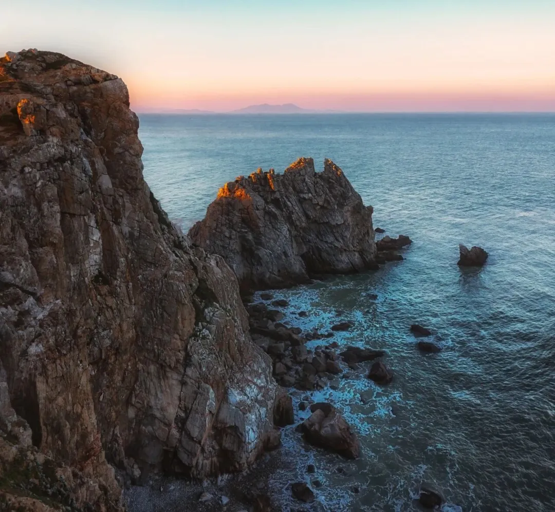 东礵岛的美,一半是温柔,一半是壮阔。一侧是90°垂直断崖,黑褐色岩壁被亿万年风浪劈削,陡峭如削,直坠深海;一侧是软绵草甸,山羊在崖边悠然踱步,海鸟在低空盘旋。狮子峰、皇帝帽等海蚀奇岩静静矗立,浪涛拍岸,声声回响,把“荒野与治愈”写到极致。