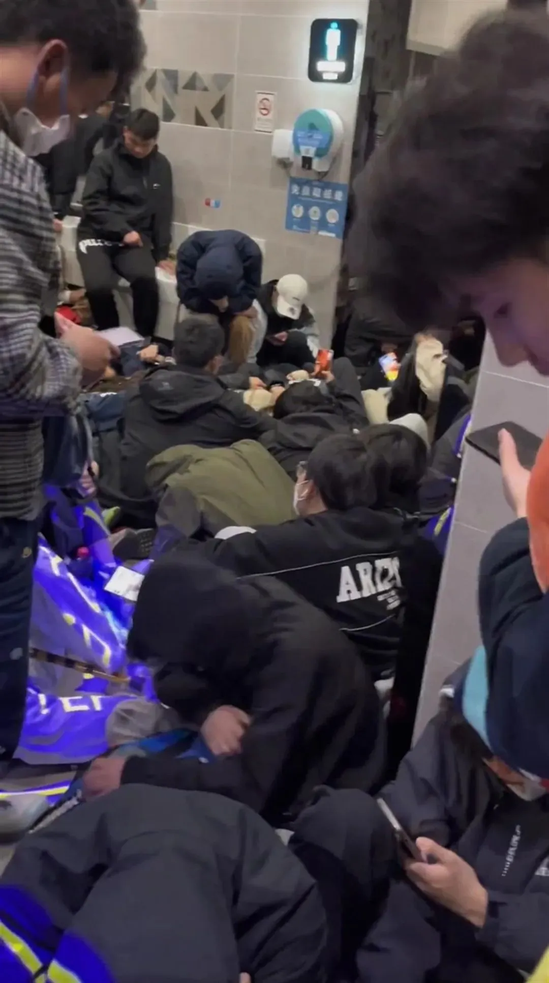 视频显示,许多人或坐或躺在厕所里过夜,有人盖着毯子,有人则穿着单衣席地而坐。现场还有语音提醒:“如果您执意夜宿,请您遵守公共秩序,不要影响他人正常如厕。”