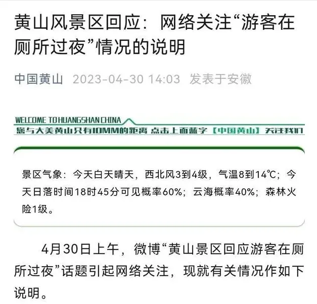 去年,黄山风景区管委会曾通过微信公众号“中国黄山”进行了回应,表示“虽经多方劝导,黄山风景区山上公共场所仍有800余名游客留宿。尽管景区不鼓励此类现象,但从确保游客安全和人性化关怀的角度,夜间打开酒店餐厅、大堂等公共厕所,尽最大努力给予基本服务。由于夜宿游客较多,公共场所容量有限,也有少数游客自行在景区旅游公厕过夜。”
