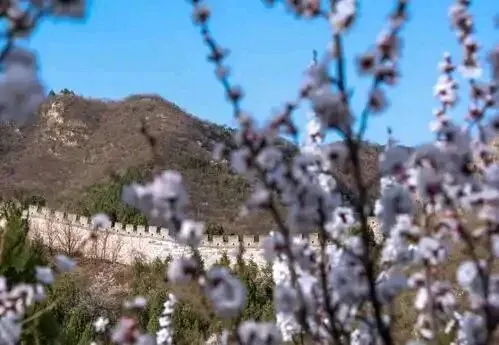 居庸关长城横卧群山。杏花沿山岭绽放,簇拥古老城垣。山势连绵,城关巍峨。列车穿花而过,春色与雄关相融。山河壮阔,春意浩荡。花添秀色,关增风骨,万里江山在此舒展磅礴气象。