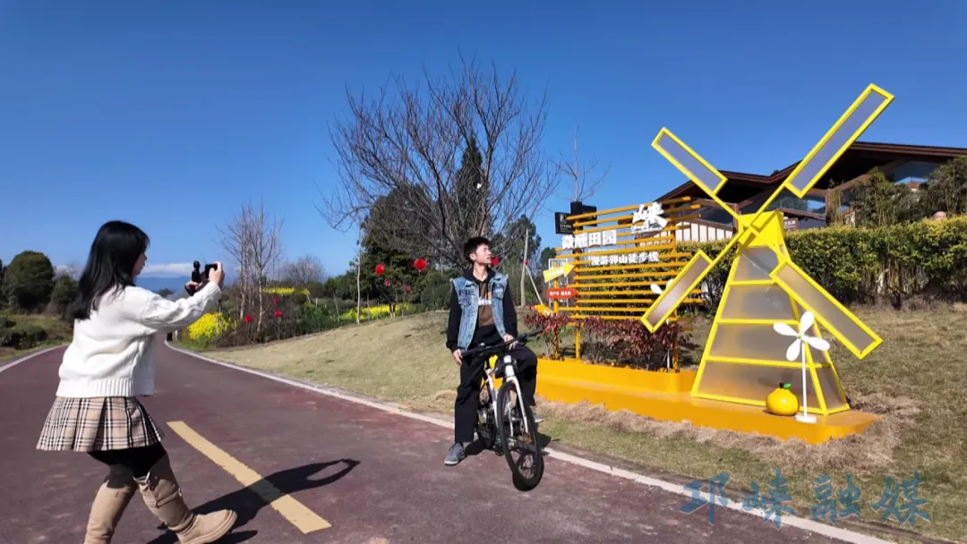 茶田旁、绿道边,处处可见游客踏青的身影。大家循着游览导视牌,或漫步徒步道、或骑行自行车生态旅游高速道,穿行于满目青翠之间,用镜头定格春日美景,在自然绿意中放松身心。串联起特色景点与林盘聚落的茶兰绿道,让游客一步一景、移步换景,尽享春日惬意。