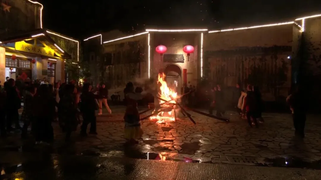 演出结束后,篝火晚会在湖心坝广场点燃。熊熊篝火映红了张张笑脸,大家手拉手围成同心圆,踏着欢快的节拍起舞。夜色中,欢歌笑语与古楼的静谧相映成趣,绘就了一幅“住有所依、住有所乐”的和谐画卷。