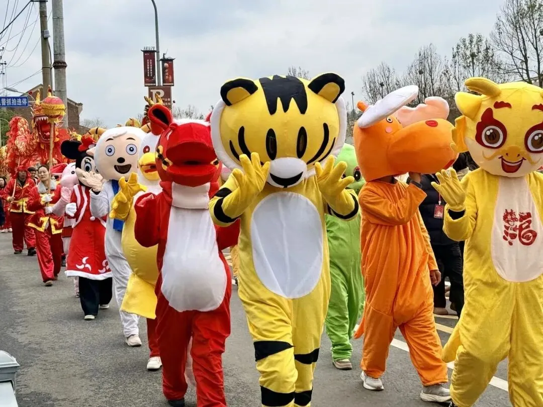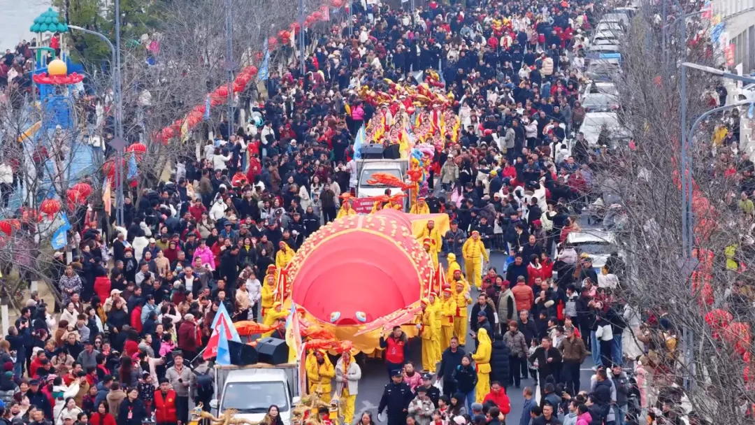 同样吸睛的还有这只长达30米的大虾,在40名舞虾人的默契配合下,上下舞动,与4只小虾组成的巡游队伍,穿梭于古城。一路走,一路赏,跟随队伍来到樱花大道,花鼓声声萦绕古城,男女演员身着特色服饰,演绎经典的花鼓《花鼓迎春俏》,唱词婉转、舞步轻快,浓浓的乡土生活气息扑面而来;40名腰鼓队演员身着红衣,鼓点整齐有力,红绸翻飞如霞,尽显向上活力。