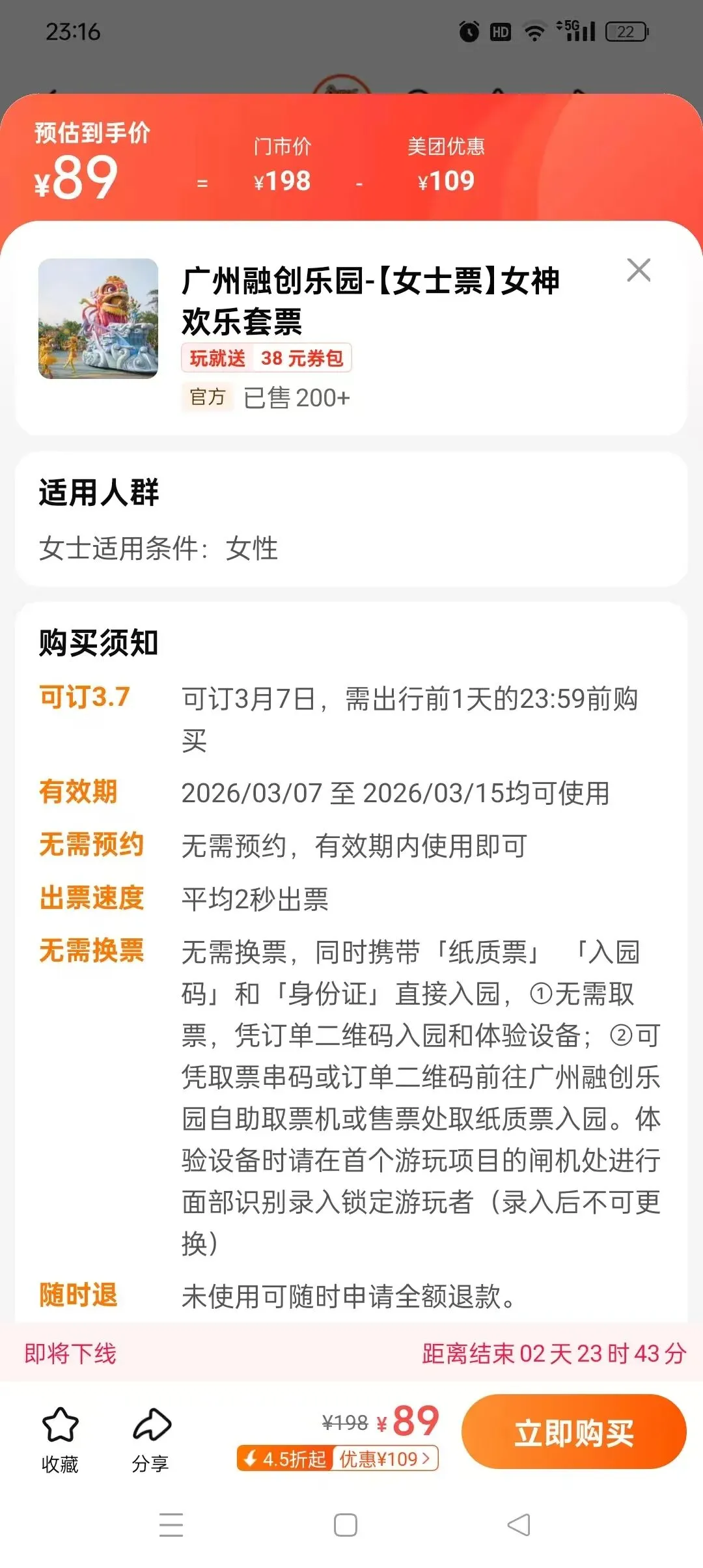 广州融创乐园女士欢乐套票1张89元,适用于1名女性(成人/儿童均可)在门票有效期(2026年3月7日-2026年3月15日)期间可用,可在有效期内选择连续游玩3天。费用包含的项目设备范围: 【岭南印象区域】怒海狂涛、狮舞欢腾、风筝翻飞、欢乐对对碰、锦绣转盘; 【五羊传说区域】五羊飞天、巨龙飞舞、大树飞椅、古宅惊魂; 【南越古国区域】云霄塔、推杯换盏、双龙飞舞; 【梦幻花园区域】花海冲浪、花苑奇境、花园派对、蝶舞飞轮、卡洛卡太空森林家庭娱乐中心; 【海上丝路区域】飞越广东、海盗船、飞鱼戏水、星空塔-天空之境、 黑珍珠号幽灵船 【梦回岭南剧场】《梦回岭南》 凭票可在有效期内选择连续游玩3天,每天可不限次游玩以上项目,以及门票整个游玩期间《梦回岭南》演艺项目(普通席)单场次观影+大马戏单场次观影。设备和演出开放情况请以游玩当日乐园实际开放为准。