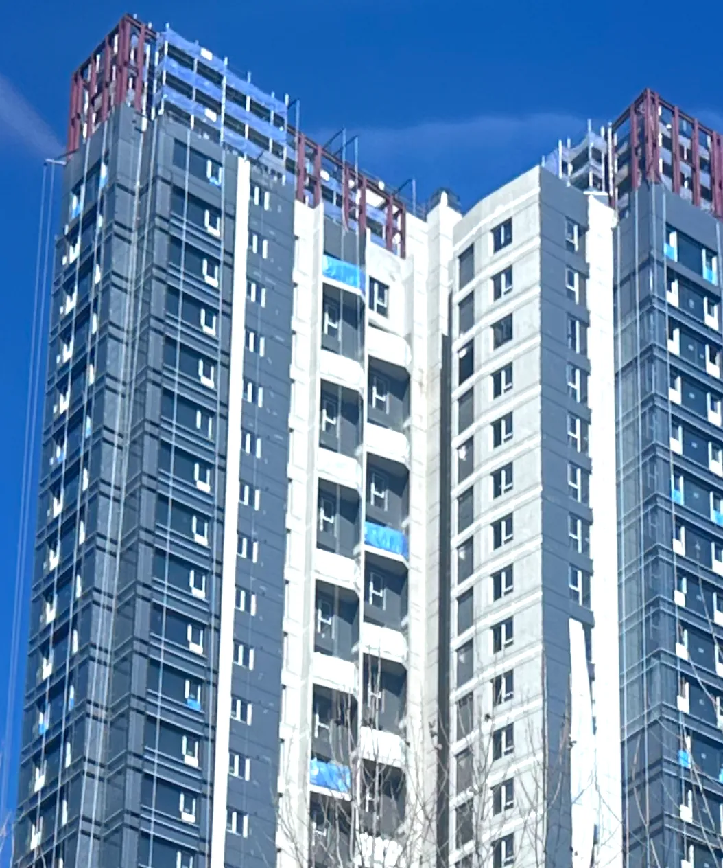 图11 一个还在建的公寓,阳台都被塑料围住,注意看建筑方别有心思的使用了蓝白不同颜色