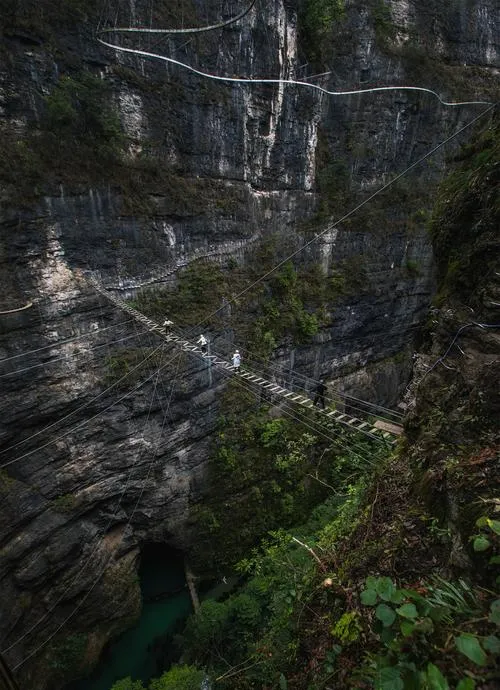 紫江地缝是喀斯特地貌塌陷形成的峡谷,深度有两百多米,这个深度意味着你走在谷底的时候抬头看天是一条线,两侧的崖壁几乎垂直,这种空间的压迫感会让人重新理解什么叫地质的力量,不是课本上的概念,是你站在那个位置真实感受到的震撼,地缝里常年有水流过,水流切割出的纹路和崖壁上的植物形成了一种奇特的景观,你会发现生命在最极端的环境里也能找到自己的位置,那些在崖壁缝隙里生长的树木用根系紧紧抓住岩石,这种顽强不需要解释就能让人感受到。