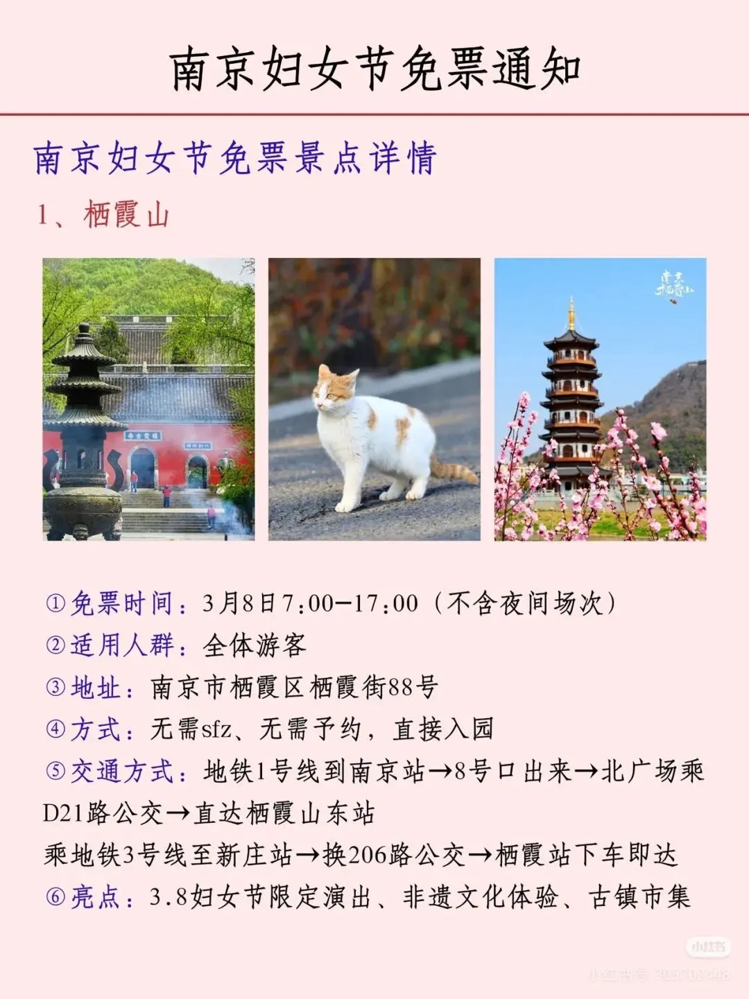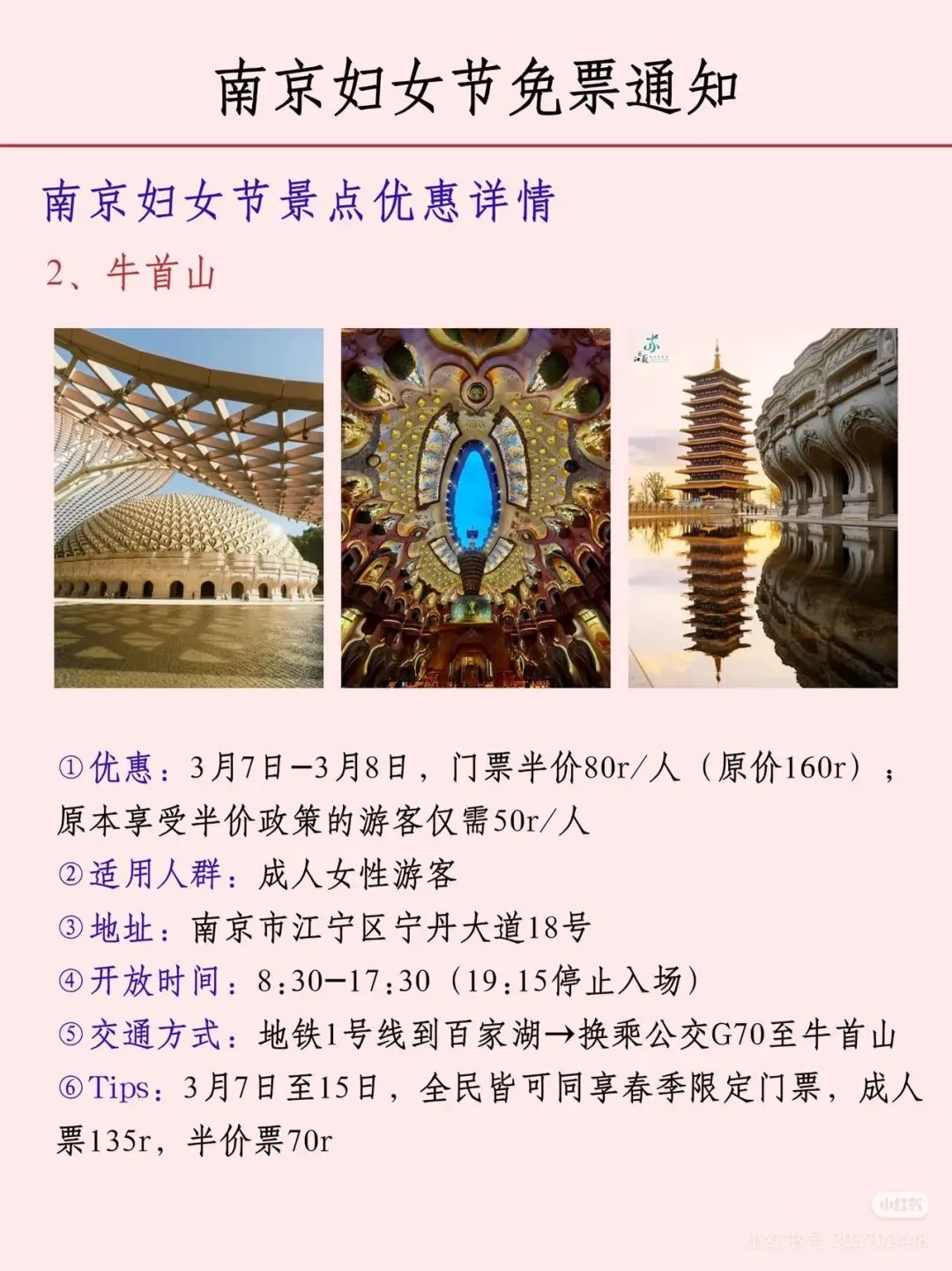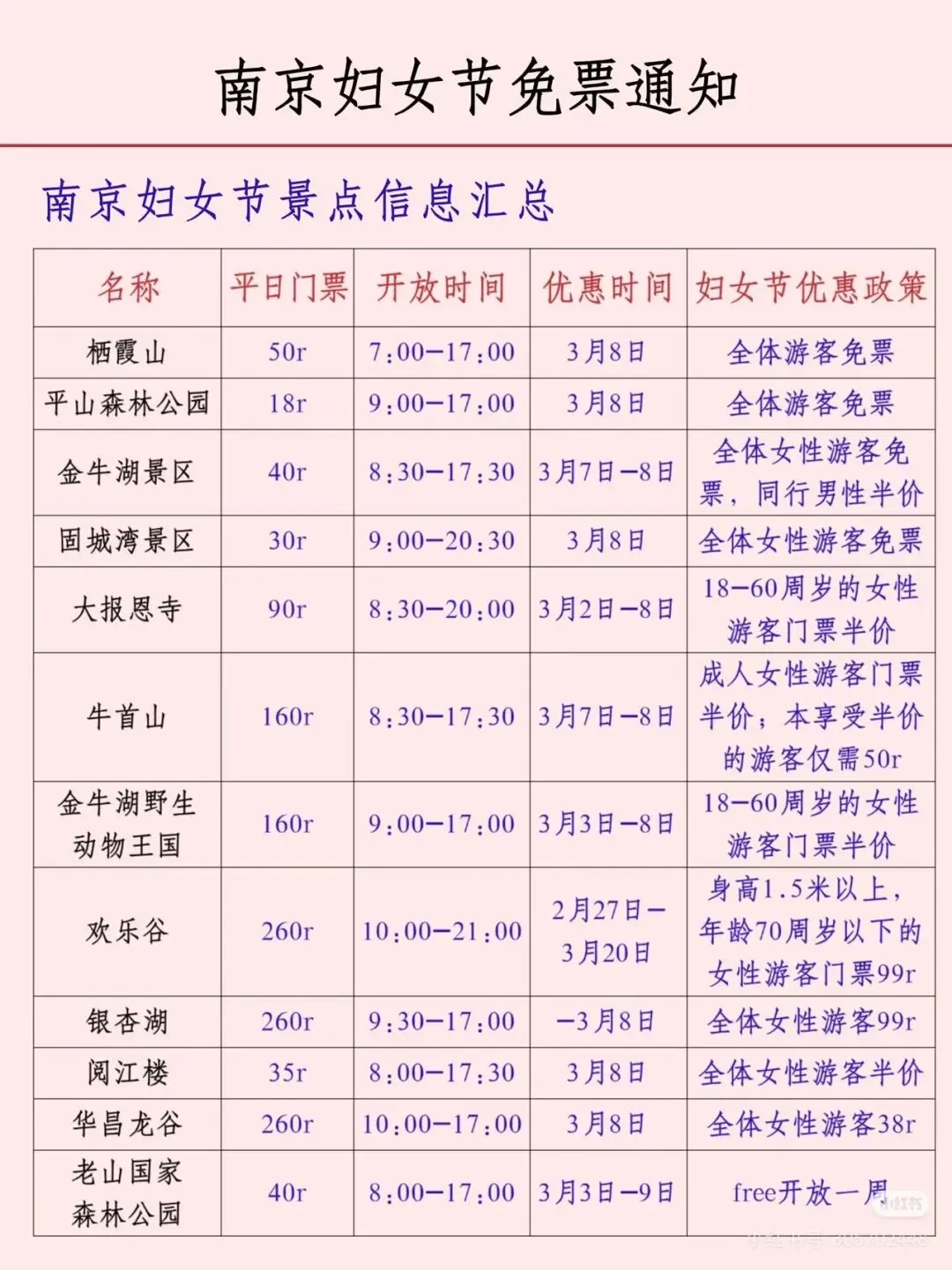 您现在的位置是:首页 > 国内旅游目的推荐 > 正文 国内旅游目的推荐 南京各大景区妇女节免票通知! admin2026年03月05日 06:42:21国内旅游目的推荐1 南京各大景区妇女节免票通知!声明:图片转自网络,如有侵权,请联系删除。 转载请说明来源于"旅荐网",部分内容转载自网络,如有侵权请联系qlwl@foxmail.com删除 本文地址:https://www.15386.cn/post/133078.html 上一篇 注意丨天津这个景区,闭园! 下一篇 包头一景区发布公告:所有设备暂停运营! 相关文章 超山风景名胜区以赏梅闻名,这里的梅花种植 包头一景区发布公告:所有设备暂停运营! 天台山景区丨春雷惊蛰始 大地万物新 徐州最受欢迎的免费景区之一 包头一景区发布公告:所有设备暂停运营! 注意丨天津这个景区,闭园! 连续3天!邯郸一景区免门票! 委员建议取消身份证住址信息!古镇景区介绍标注作者为DeepSeek 【安全】郑州一女子景区坐山地飞车脚被甩出车外,撞上跑道多处骨折…… “大慈恩寺”景区将是天台山旅游的一匹黑马 发表评论 取消回复 评论列表 这篇文章还没有收到评论,赶紧来抢沙发吧~