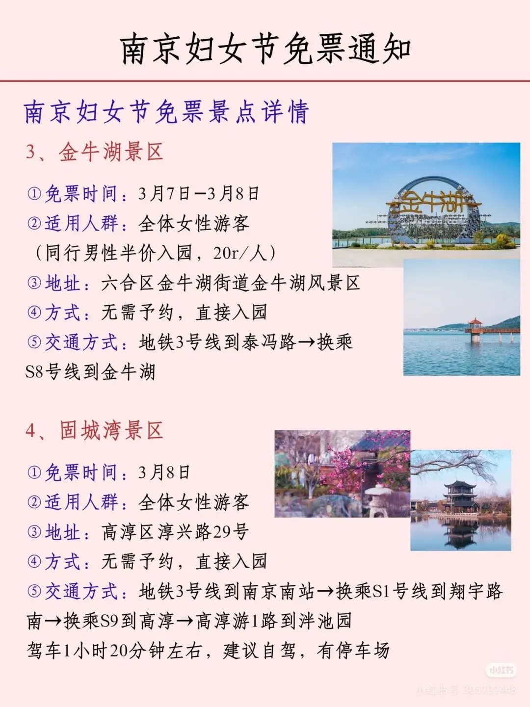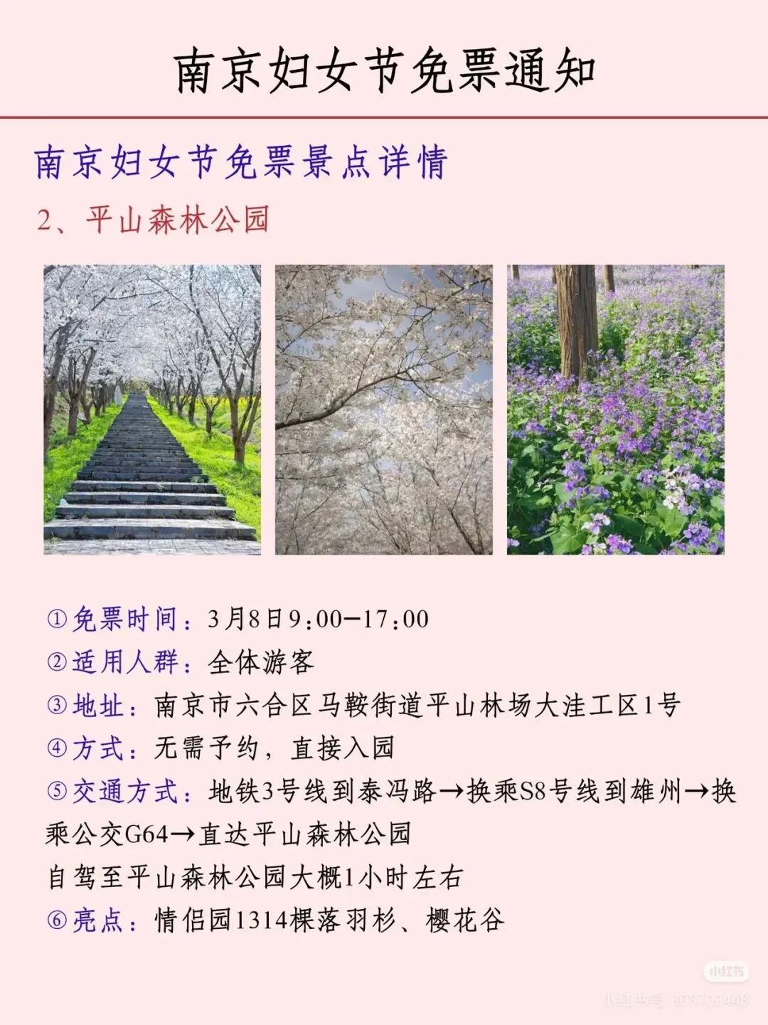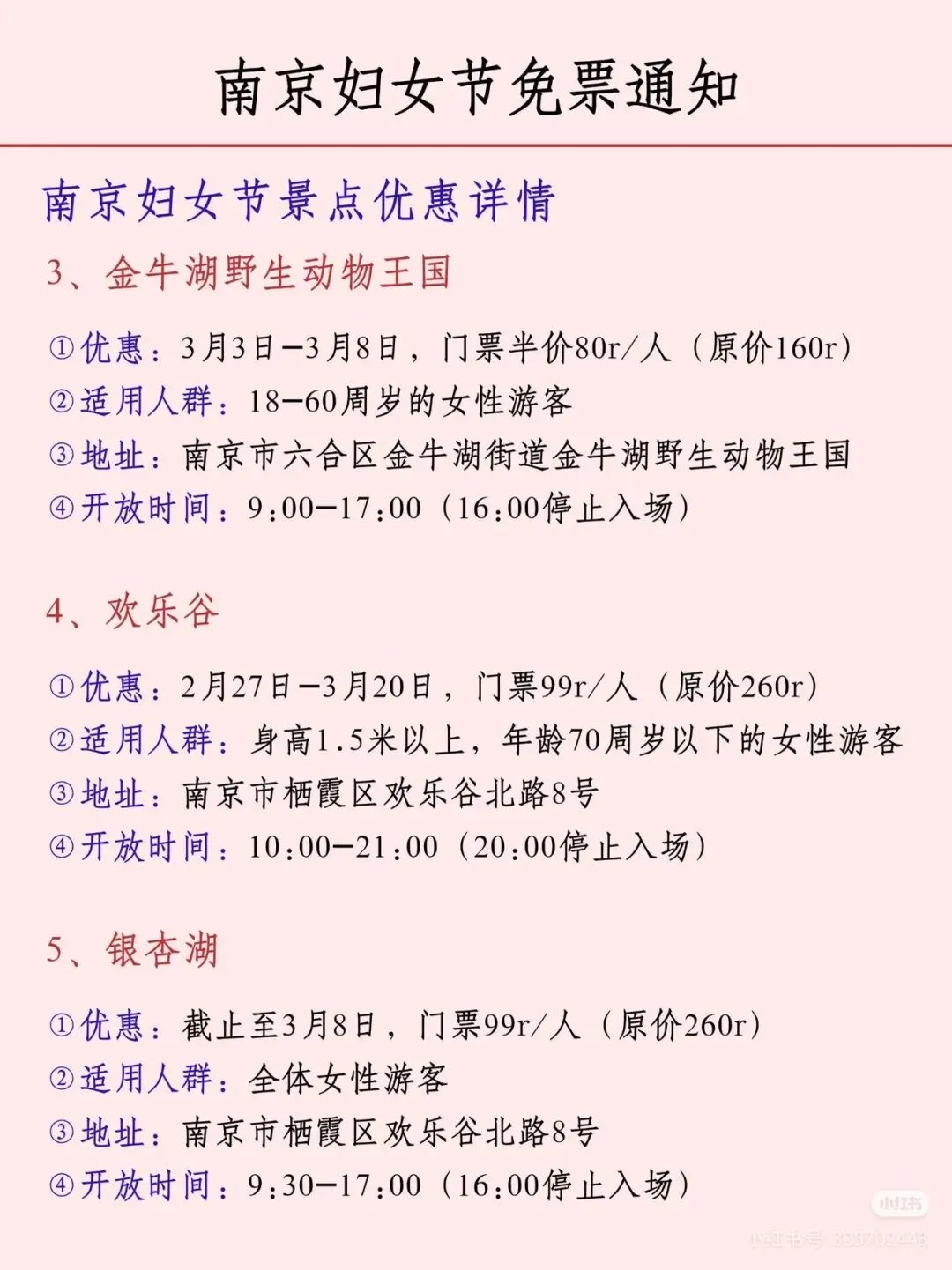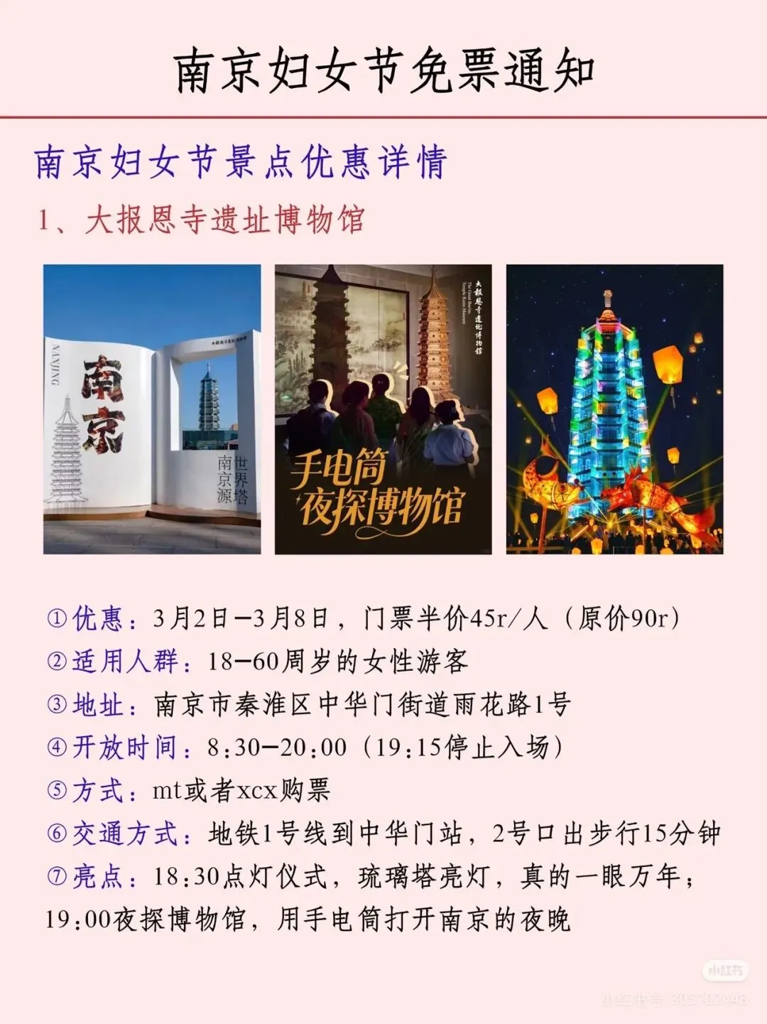 您现在的位置是:首页 > 国内旅游目的推荐 > 正文 国内旅游目的推荐 南京各大景区妇女节免票通知! admin2026年03月05日 06:42:21国内旅游目的推荐1 南京各大景区妇女节免票通知!声明:图片转自网络,如有侵权,请联系删除。 转载请说明来源于"旅荐网",部分内容转载自网络,如有侵权请联系qlwl@foxmail.com删除 本文地址:https://www.15386.cn/post/133078.html 上一篇 注意丨天津这个景区,闭园! 下一篇 包头一景区发布公告:所有设备暂停运营! 相关文章 超山风景名胜区以赏梅闻名,这里的梅花种植 包头一景区发布公告:所有设备暂停运营! 天台山景区丨春雷惊蛰始 大地万物新 徐州最受欢迎的免费景区之一 包头一景区发布公告:所有设备暂停运营! 注意丨天津这个景区,闭园! 连续3天!邯郸一景区免门票! 委员建议取消身份证住址信息!古镇景区介绍标注作者为DeepSeek 【安全】郑州一女子景区坐山地飞车脚被甩出车外,撞上跑道多处骨折…… “大慈恩寺”景区将是天台山旅游的一匹黑马 发表评论 取消回复 评论列表 这篇文章还没有收到评论,赶紧来抢沙发吧~
