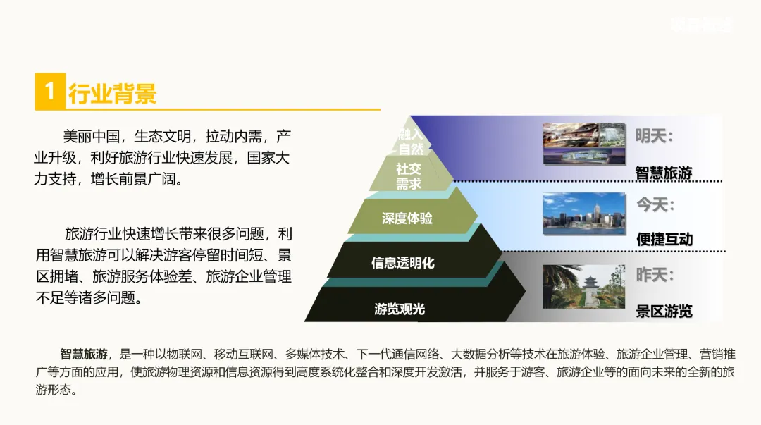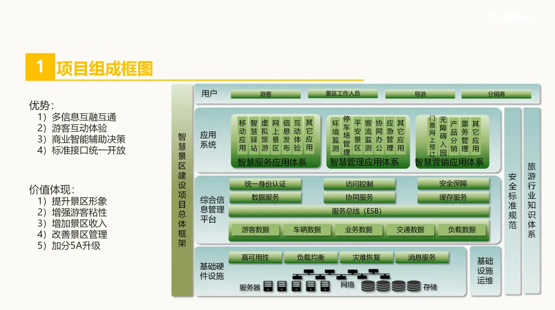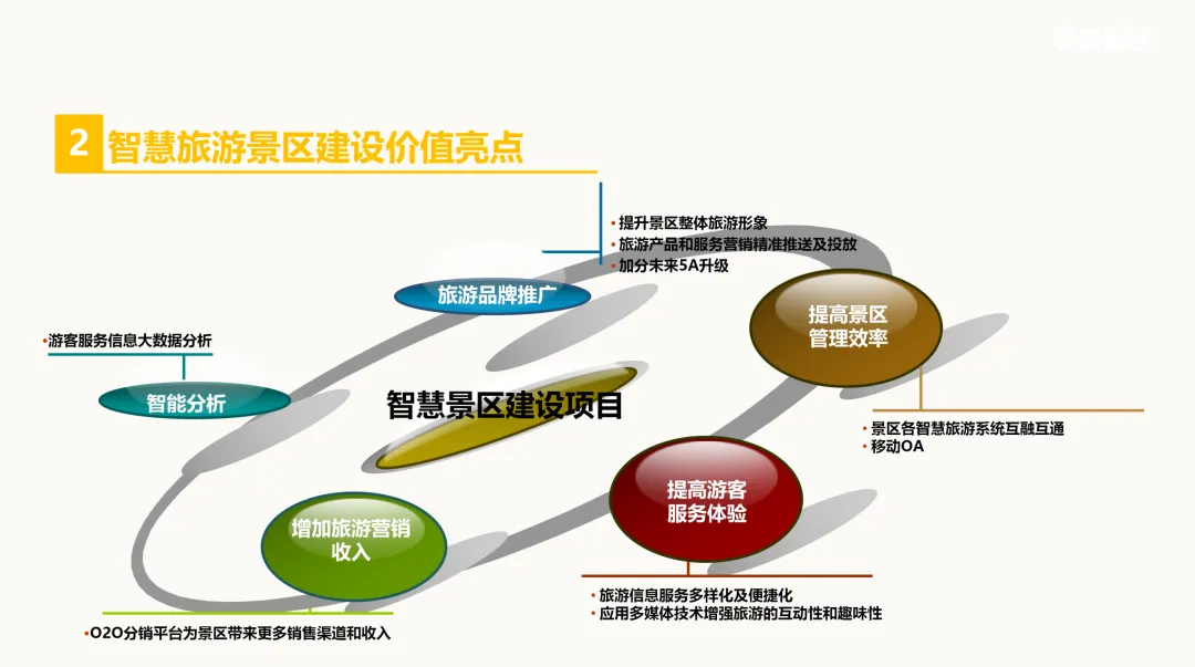 方案首先明确了智慧旅游的定义,即利用物联网、移动互联网、多媒体技术、大数据分析等先进技术,在旅游体验、企业管理、营销推广等方面进行深度应用,实现旅游资源的系统化整合与深度开发。这一理念贯穿整个规划,为景区带来了智能分析、品牌推广、服务体验提升、营销收入增加及管理效率提高等多重价值亮点。