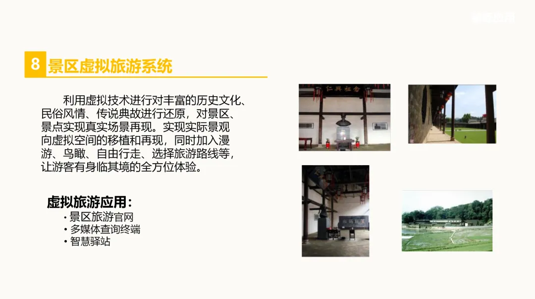 在服务应用方面,方案强调了移动终端应用的重要性,通过智能地图导航、景点智能导览、奇幻相机等功能,增强游客的参与感与趣味性。此外,还提出了虚拟旅游系统、网上景区等创新应用,让游客在未到景区之前就能提前感受其魅力,提升旅游期待值。