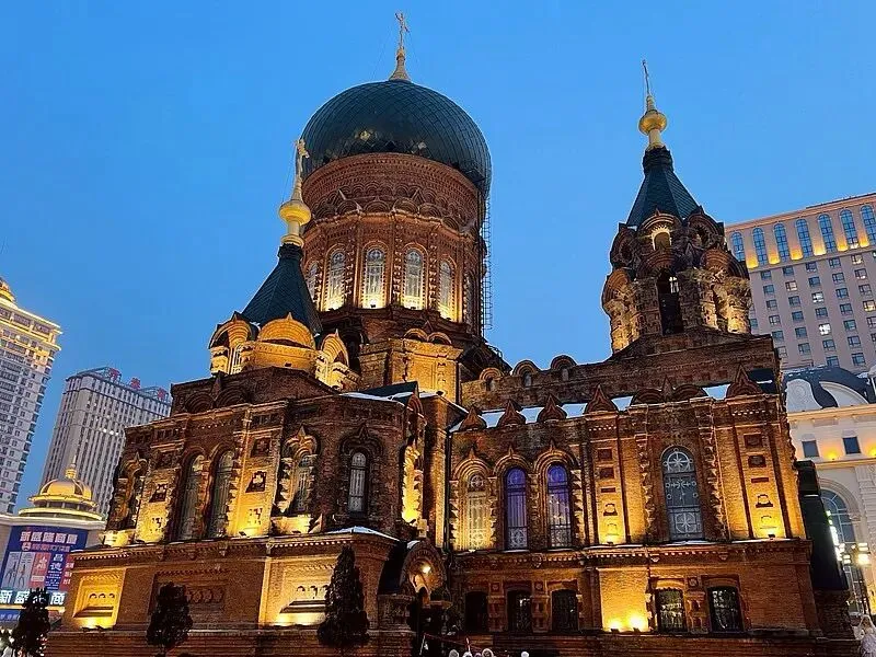远东最大的东正教教堂之一,绿色穹顶、红砖墙体、白鸽盘旋,无论白天还是夜晚都极具氛围感。内部现为建筑艺术博物馆,记录着哈尔滨的百年岁月。