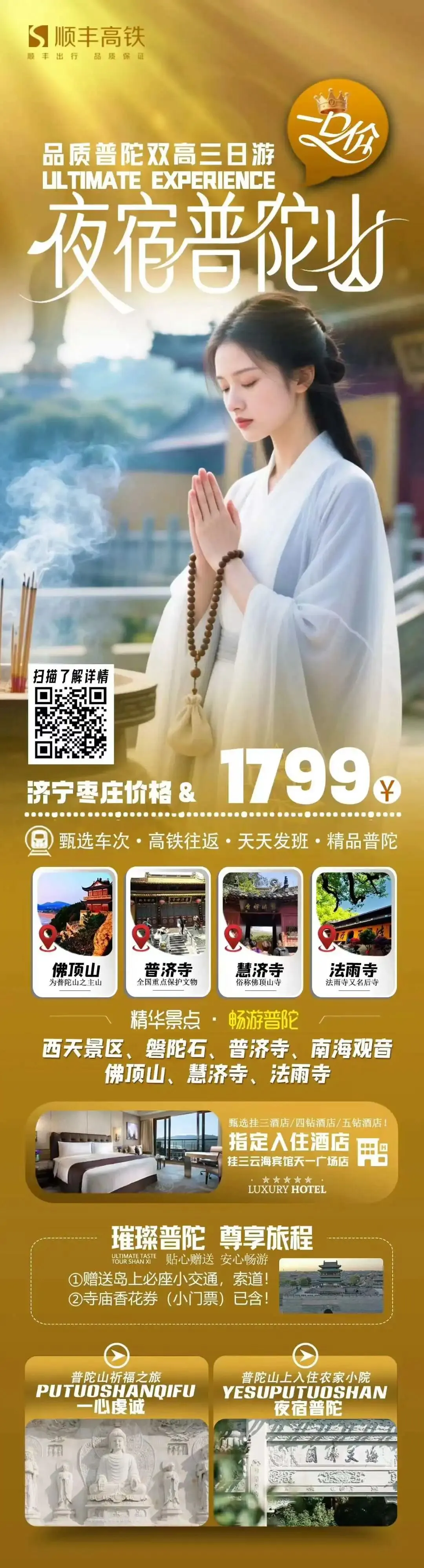 1799元/人 夜宿普陀山西天景区、磐陀石、普济寺、南海观音、佛顶山、慧济寺、法雨寺*赠送山上索道!含寺庙香花券、岛上小交通双高三日游