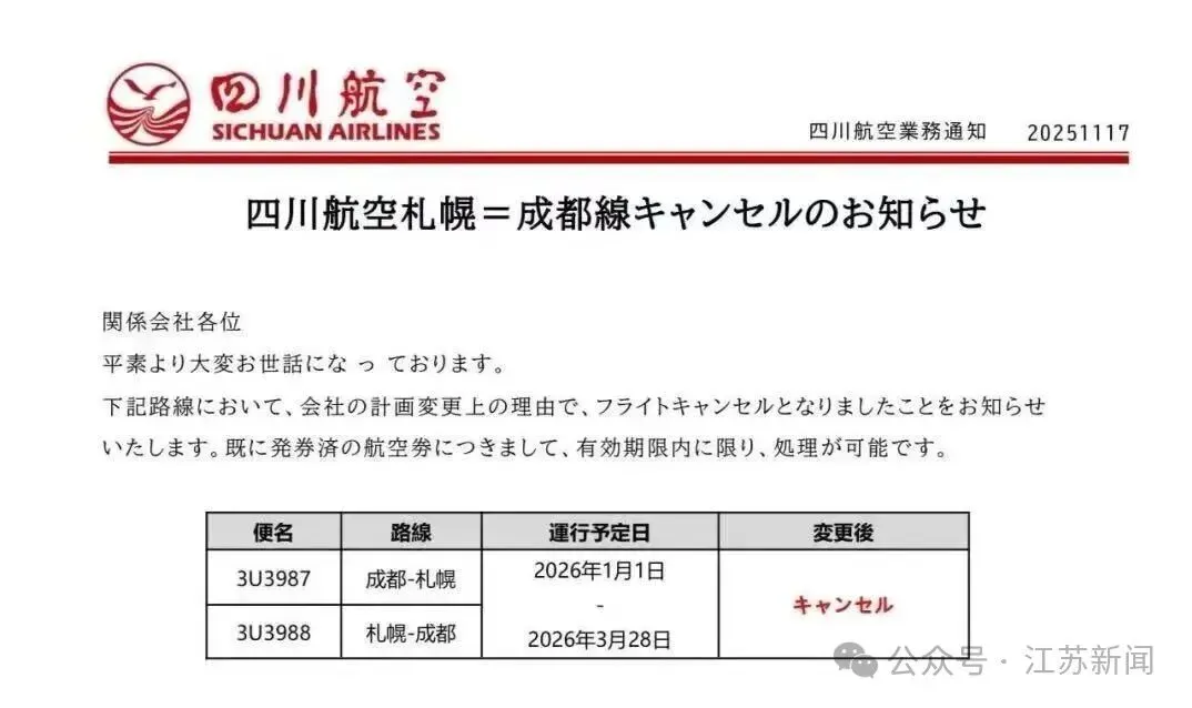 此外,四川航空已取消2026年1月1日至2026年3月28日期间成都往返札幌的航线计划;春秋航空有多班涉日航线显示“航班取消”。