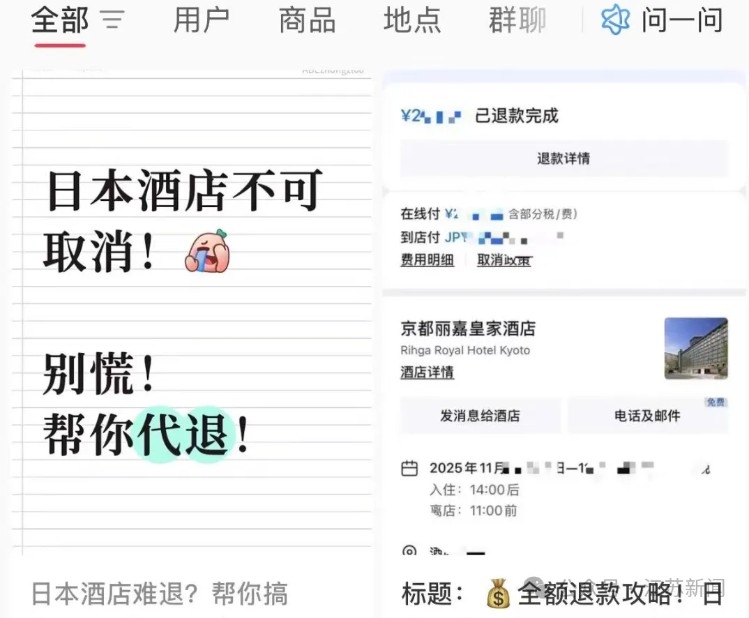 旅客北北(化名)原定11月20日至24日前往日本京都旅行,在家人出于安全考虑的劝阻下,她最终决定取消行程。她告诉记者,其预订的1575元往返机票实现了“丝滑退款”,未产生手续费;甚至连预订时标注“不可取消”的酒店订单,也在16日获得了全额退款。