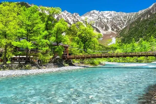 這是位於長野縣岡谷市、諏訪市、諏訪郡下諏訪町,縣內最大的湖,湖內棲息著大、小天鵝等野鳥、魚類和貝類,生物種類豐富。大家可以搭乘遊覽船在湖面上暢遊觀賞,冬季時還會有居民在結冰的湖面上鑿洞垂釣。江戶時代該湖也是名勝之一,著名浮世繪大師葛飾北齋也在《富岳三十六景》中描繪了從諏訪湖遠望富士山的場景。除此之外,諏訪湖也因為是熱門動畫電影《你的名字》中女主角家鄉「系手町」的舞台設定,再度成為熱名景點。想要眺望諏訪湖的話,可以爬到立山公園,這裡除了能一覽與劇中相似的壯闊美麗盆地地形,也可欣賞落日與夜景。另外,每年8月會舉辦盛大規模的「諏訪湖祭湖上花火大會」與9月的「日本全國新作花火競技大會」,年年吸引眾多遊客造訪,一同觀賞由全國聚集自此的煙火師所設計的原創花火與音樂共舞。上高地以其獨特的風景聞名,舒適地坐落在北日本阿爾卑斯山的中心地帶,是自然度假的理想休養地。上高地在3億年前曾為海底,長年激烈的造山運動與河川侵蝕造就了現在這般神秘的自然景色,人們也稱此為「神降地(神明降落之地)」。洶湧的梓川蜿蜒地穿過上高地,發源於槍岳某處的泉水,一直流到日本最長的河流信濃川。要到達對岸,可以穿過著名的河童橋,並欣賞附近那經常冒煙的燒岳之壯麗景色。