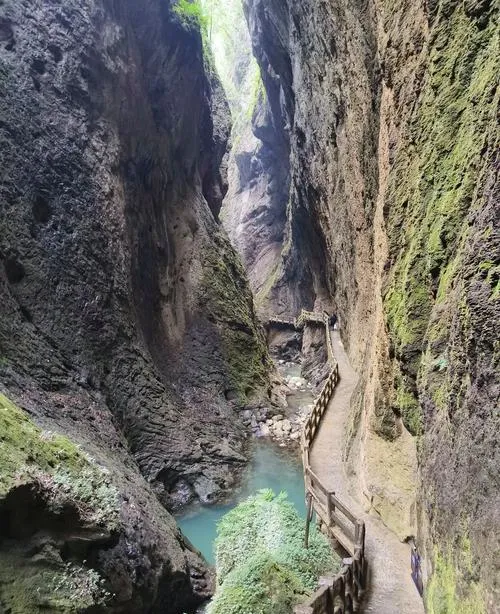 如果说天生三桥是横向的震撼,龙水峡地缝就是垂直的绝境。这条地缝最窄的地方两边石壁只有几米宽,但深度有上百米,走在栈道上,抬头只能看到一线天空,两边的石壁像是要合拢过来。很多人去了会有种透不过气的感觉,但正是这种压迫感让你体会到什么叫地质的暴力美学,这不是温柔的自然,是自然在展示它的力量。