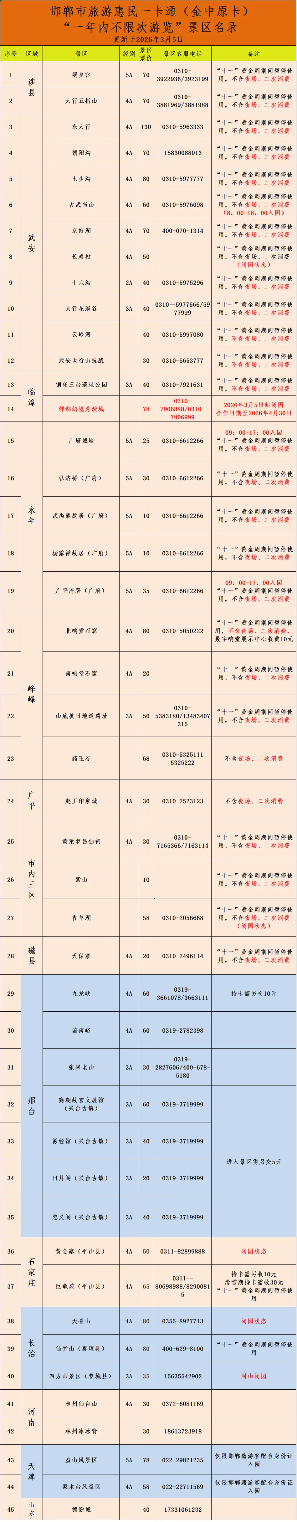 【最新最全】“邯郸旅游年票”免费不限次景区名录(更新于2026年3月5日)