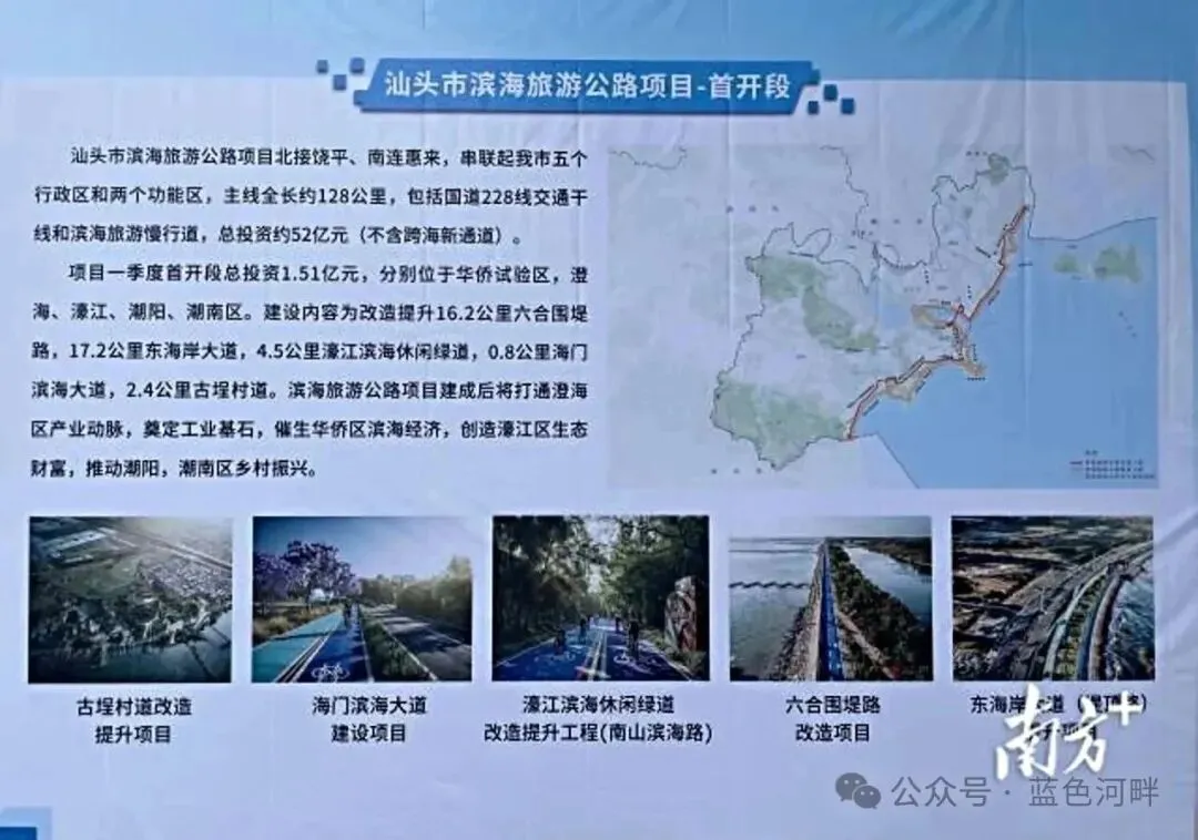 据悉,该项目北接饶平、南连惠来,串联起汕头市五个行政区和两个功能区,主线全长约128公里,包括国道228线交通干线和滨海旅游慢行道,总投资约52亿元(不含跨海新通道)。