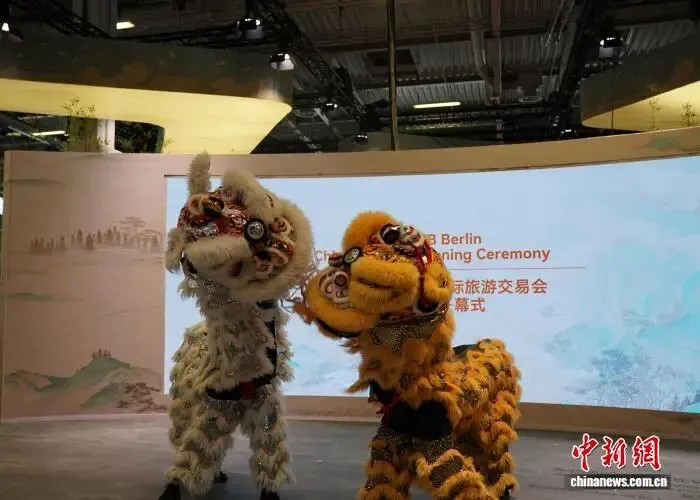 当地时间3月3日,2026年柏林国际旅游交易会(ITB)在柏林会展中心开幕。图为中国展区开幕式上的舞狮表演。