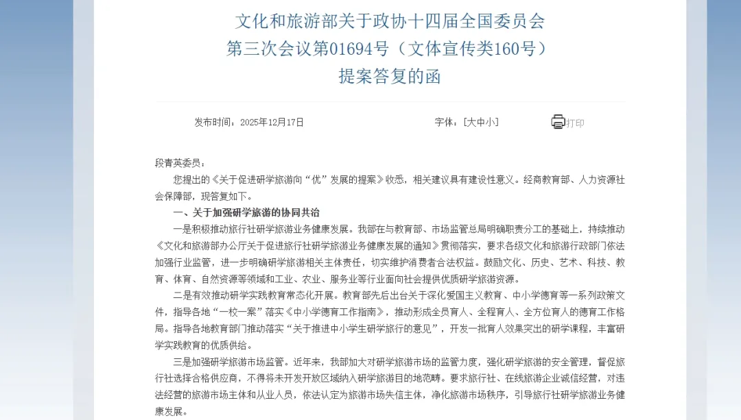 文化和旅游部《关于促进研学旅游向“优”发展的提案》的答复