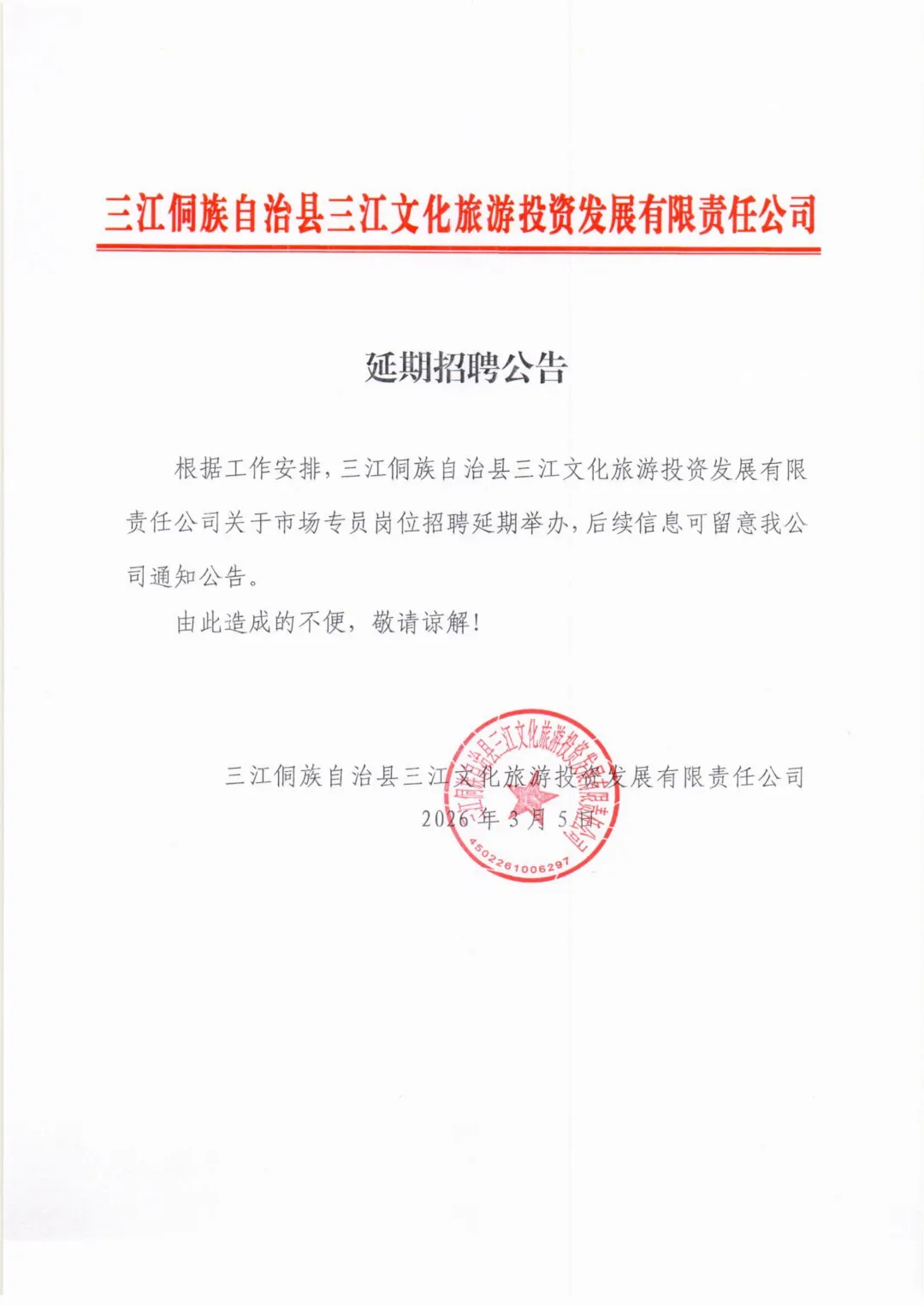关于三江侗族自治县三江文化旅游投资发展有限责任公司市场专员岗位招聘延期的公告