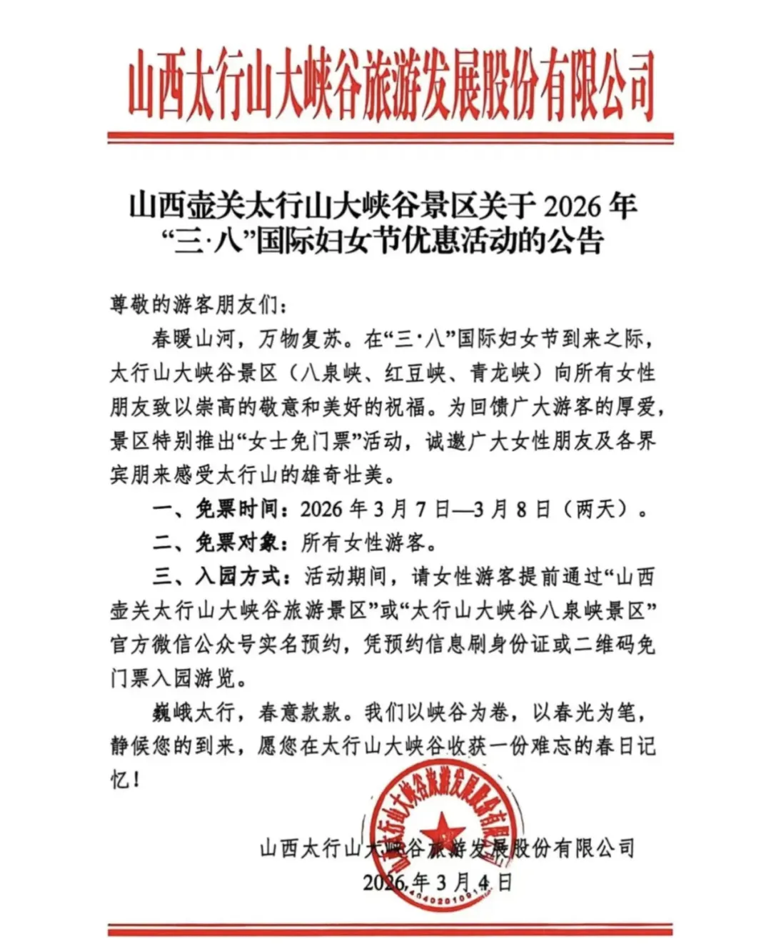 3·8妇女节--山西+豫晋交界·免票景区清单