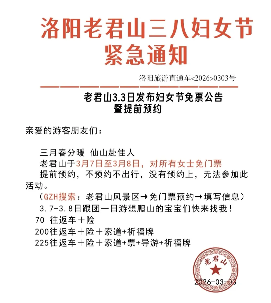 老君山|3.7-3.8 女性免票