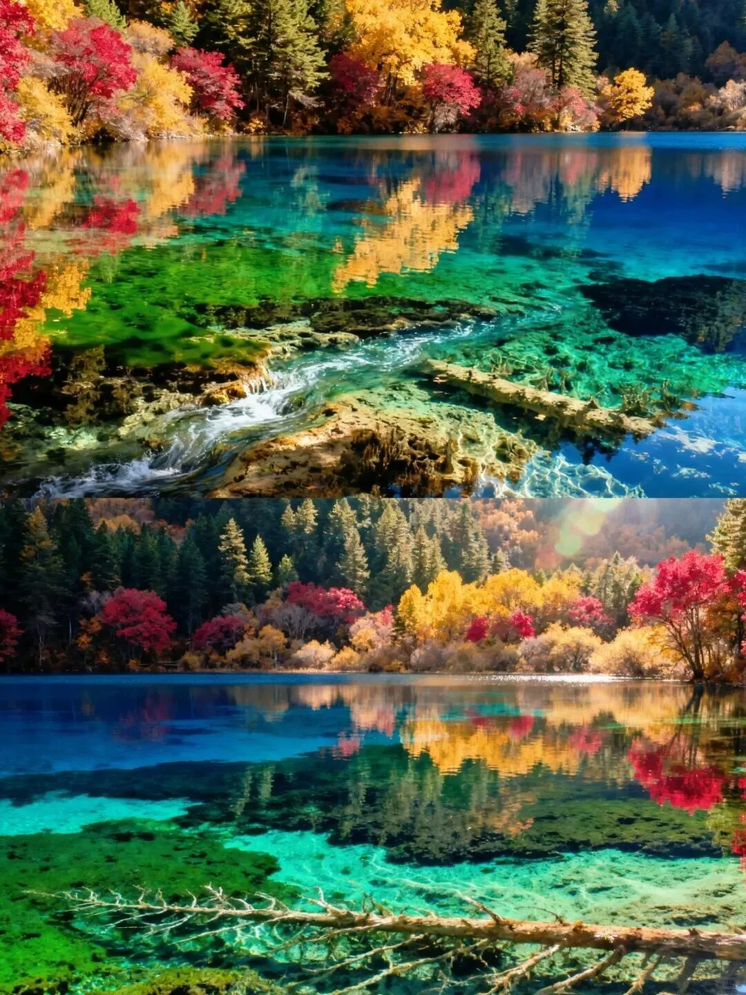 秋天去,.叶子黄.红绿都.有.,倒映在水里,.颜色能多到.数.不过来。长海那.片蓝,看一眼心.就静了。五花海.底下躺着的枯.木,裹了一层钙华,.像玉.化的龙骨。走路要当心,不然光.顾看水,.容易踩空。