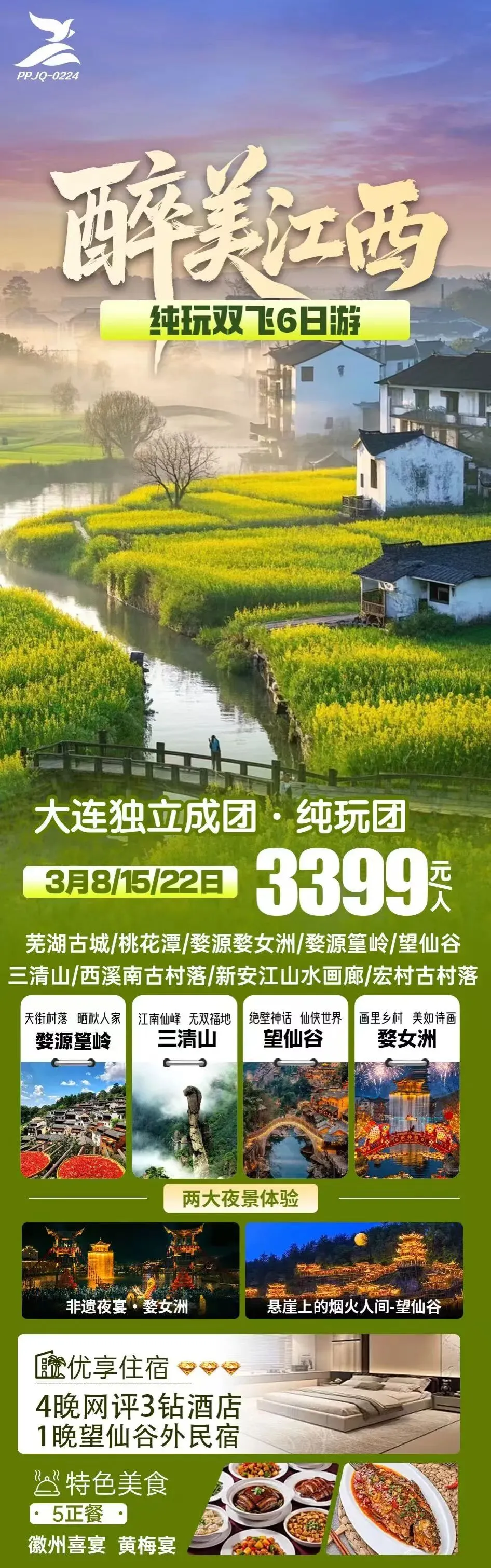 3月24日 3599元/人 醉美千垛纯玩双飞6日游