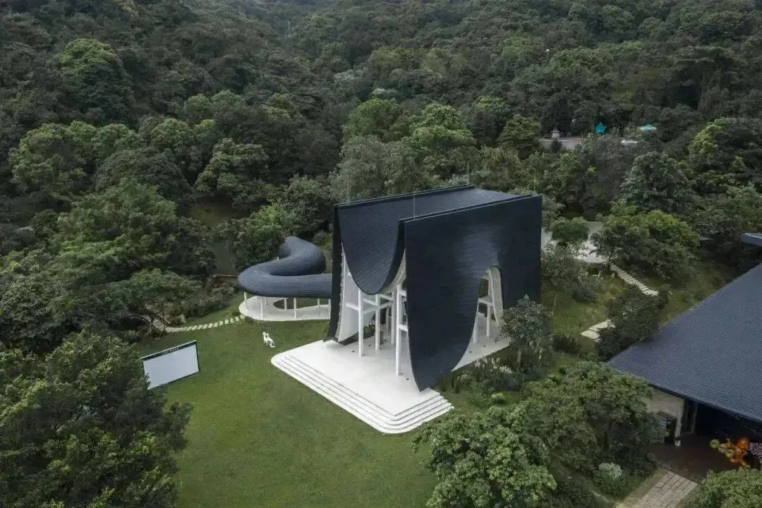 位于广州从化桃花小镇内。背靠大金峰,四面环山,周围被树木环绕,与山谷地形巧妙的融合。