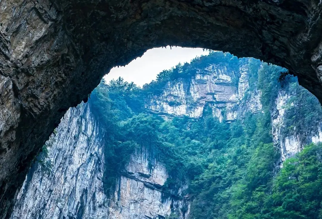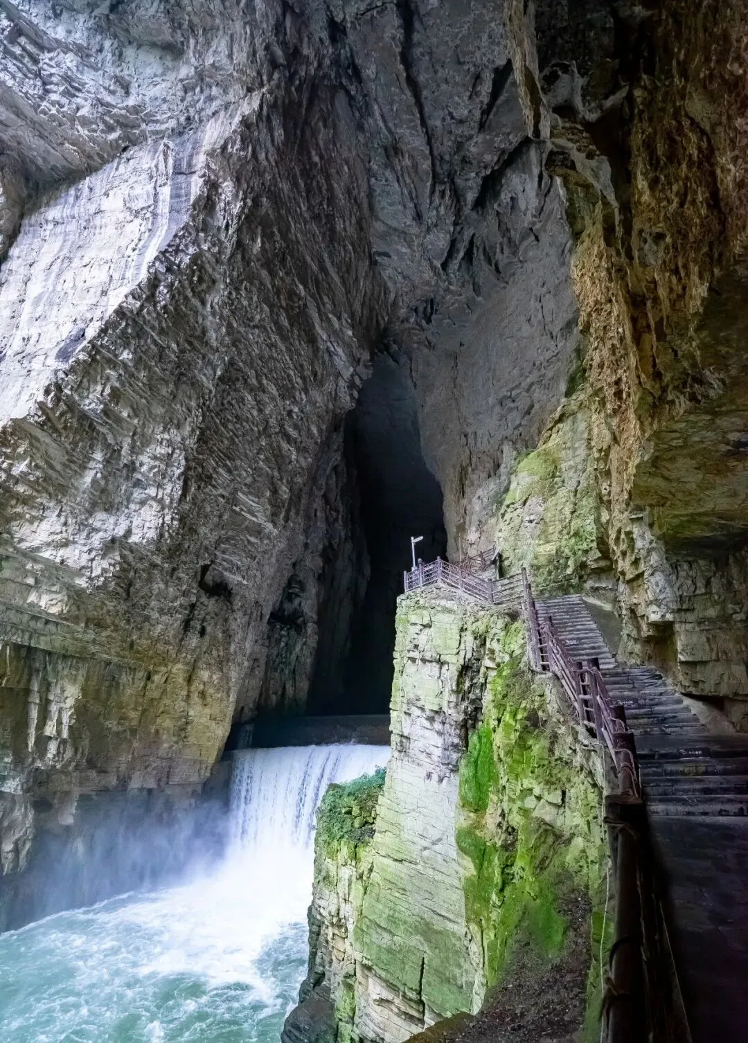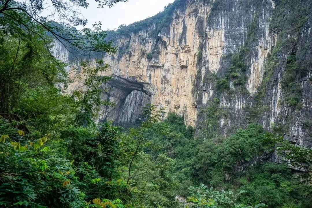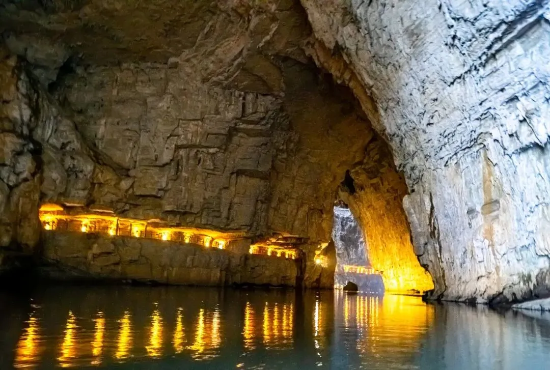 沿峡谷继续前行,脚下是绮结河。河水时而湍急,时而平缓。峡谷中乱石丛生,林木葱郁。崖壁上架有木质栈道,沿栈道徐行,不久便至峡谷尽头,河水在此消失——原来绮结河自峡谷西端流入,东端尽头则潜入地下,成为地下河。