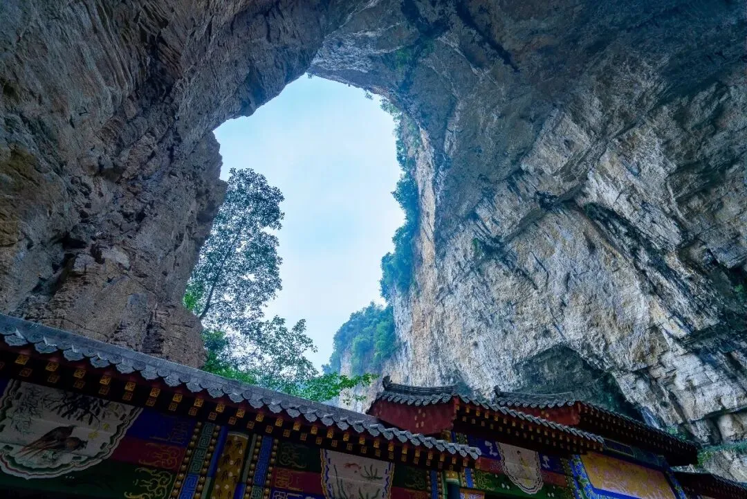 走过平台,穿过一座巨大的洞口,便来到大槽口峡谷。回望来路,连接峡谷的洞口竟是一座天生桥,名为“金谷天生桥”。不远处有观景平台,透过桥下洞口,可远远望见金谷大佛。