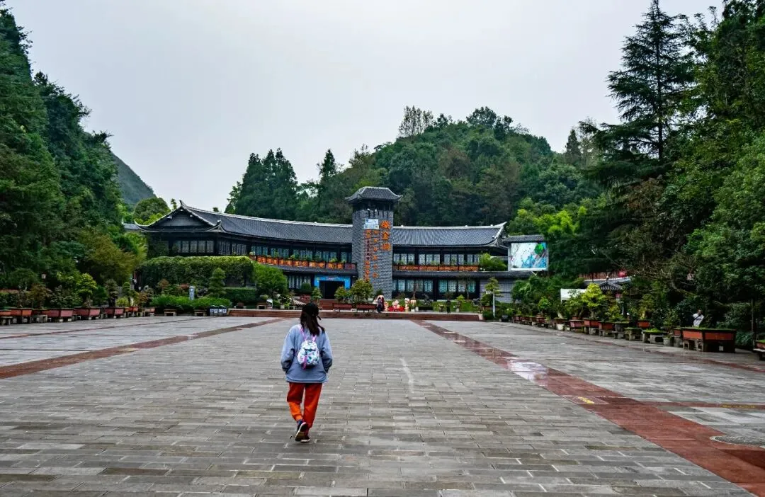出洞后步入一段峡谷,从地质结构看,应为断层遗迹。前行不远处,见到小槽口天坑的指示牌,才知方才所见并非普通峡口,而是一处天坑。天坑四壁陡峭,呈桶状,立于坑底仰望天空,颇有“井底之蛙”之感。绮结河从坑底流过,园区在此搭建了观景平台,并修建了长廊和仿古建筑,是游客休憩的好去处。