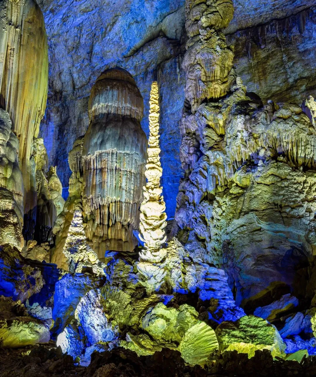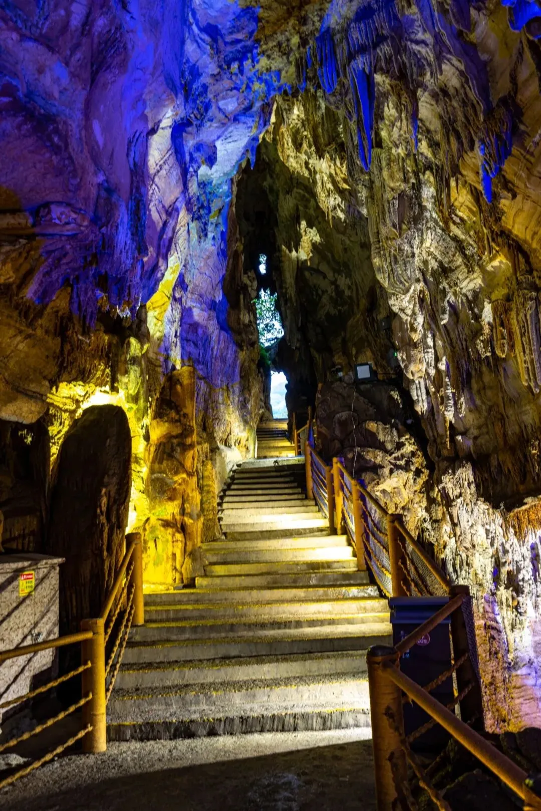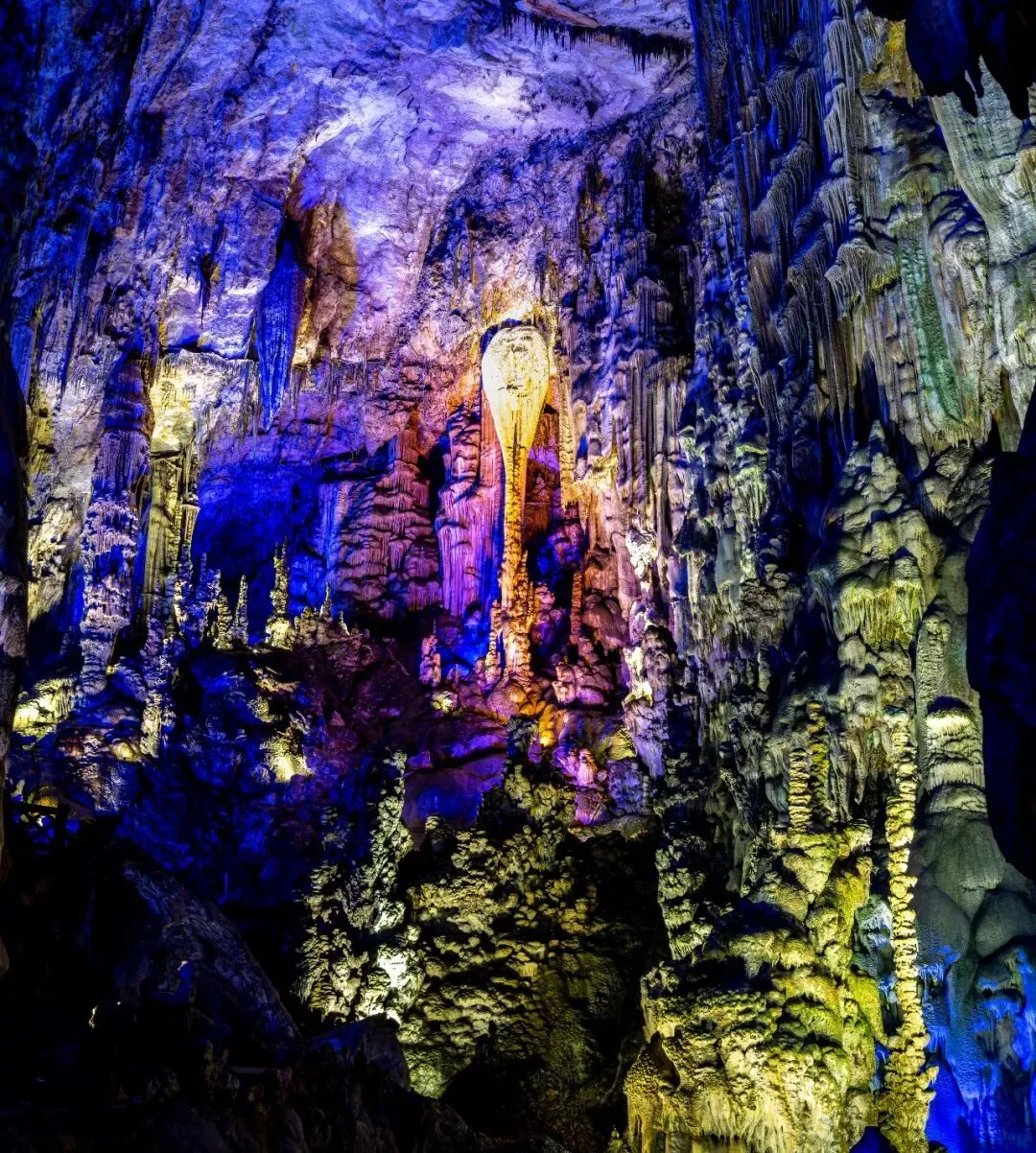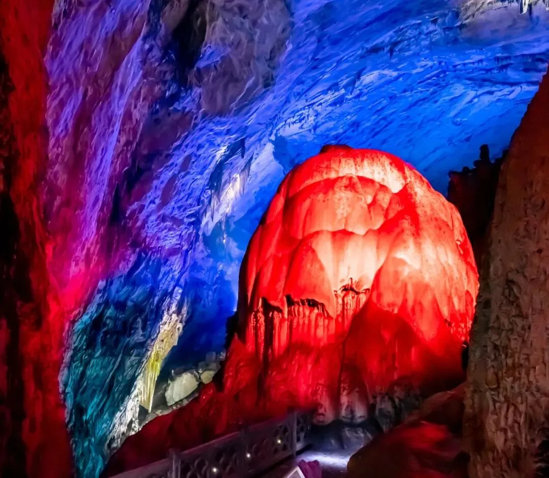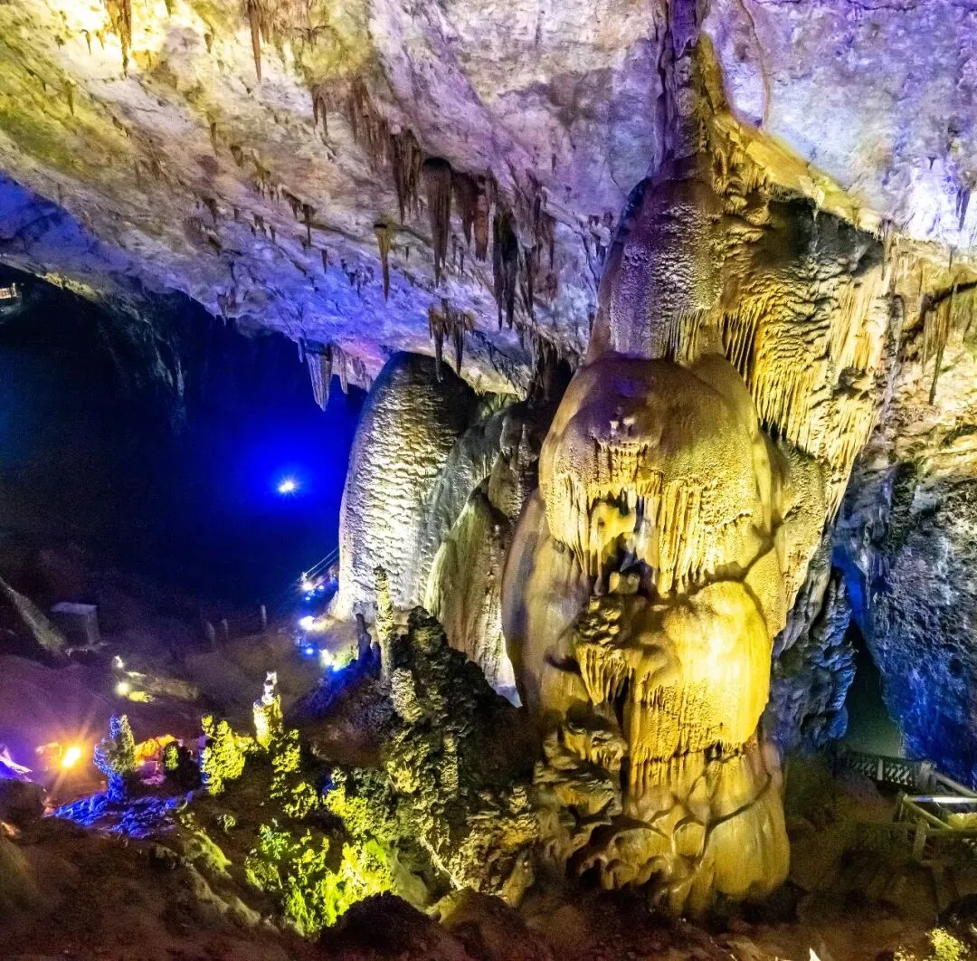 沿狭窄通道步入下一层洞穴,眼前景象顿如地下宫殿,绚丽璀璨,恍若仙境。