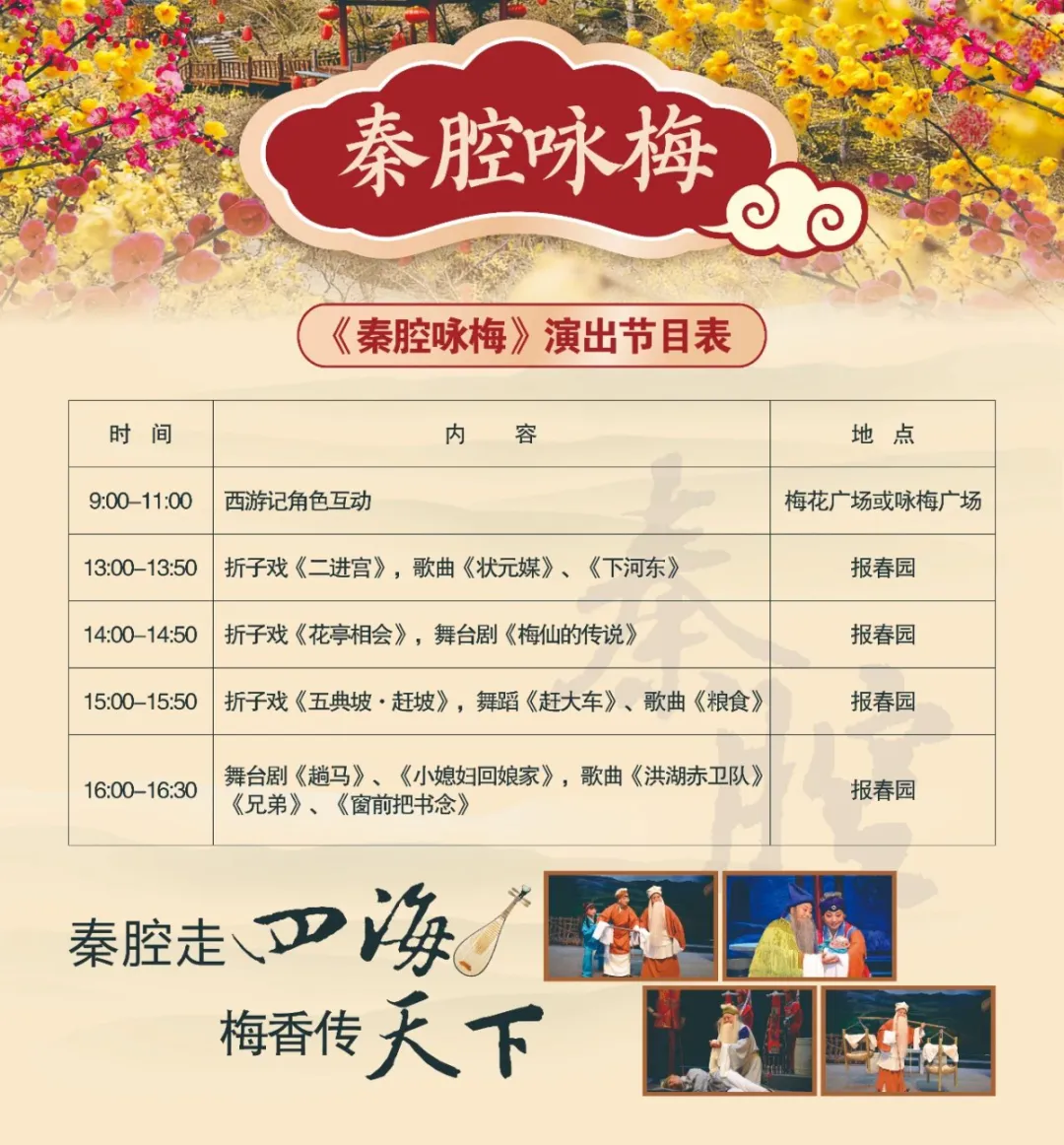 特邀专业秦腔剧团驻场演出,经典折子戏、舞台剧轮番上演。《二进宫》《五典坡》《花亭相会》《梅仙传说》等秦腔好戏连台,锣鼓铿锵、唱腔高亢,在青山梅林间,重温陕西非遗韵味。戏里唱巾帼,花间敬女性。听一曲秦腔慷慨,赏一路梅花芬芳。