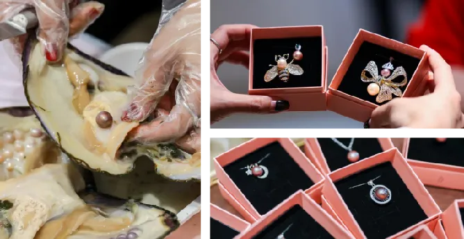 用专业的工具开蚌,捡珍珠,将其打磨抛光,镶嵌到自己喜欢的饰品上,如吊牌、耳钉或者情侣戒指。特别具有意义与成就感!