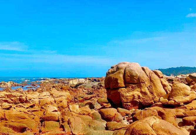 这个湾的特点是沙滩上散布着大大小小的礁石,形状圆润,像棋子一样,但这些石头不是装饰,是海浪几万年磨出来的,你蹲下来仔细看,能看到石头表面被水流冲刷的纹路,那种纹路是时间留下的痕迹,让你明白地貌不是一开始就这样的,是被持续塑造的结果。