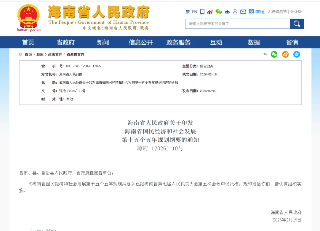 海南省人民政府官网:https://www.hainan.gov.cn/hainan/szfwj/202602/ad30594c1e7d473d99bfbfe883da471f.shtml?ddtab=true