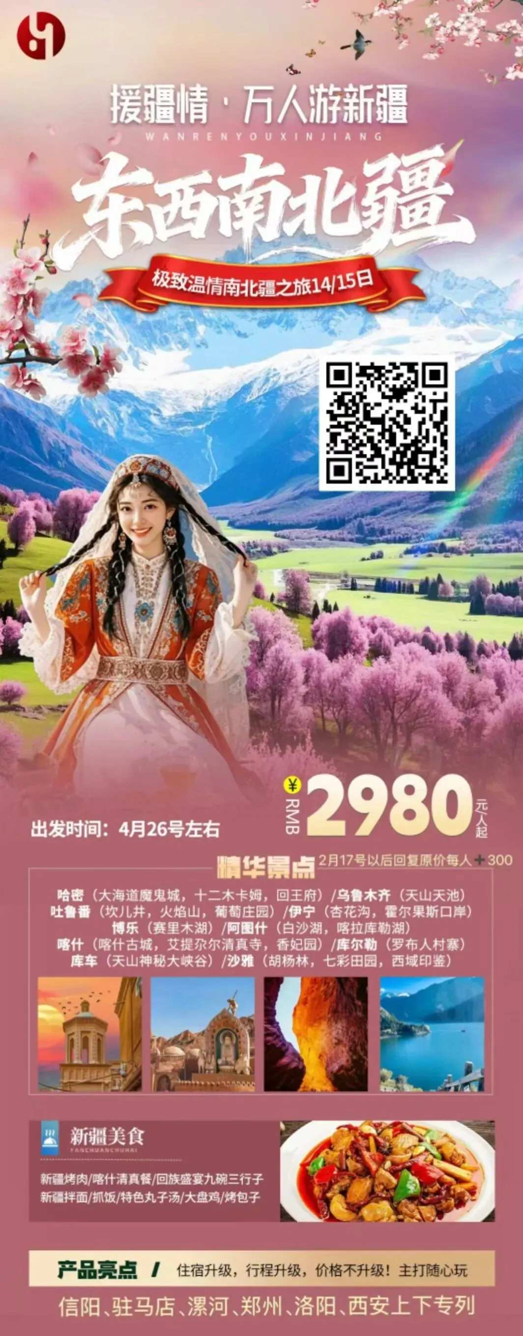 “疆豫情”对口援疆(新疆)旅游专列15日游,最美人间四月天;专列可减少3000公里大巴车程,保健医护,全陪跟随安心,4月26日左右