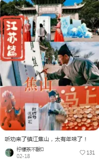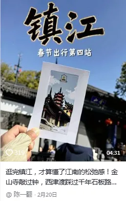 春节前后,“杭州班长”接连发布两条关于镇江的旅游宣传视频,一条探寻金山寺的历史传说,一条深挖北固山的三国底蕴,带着百万粉丝解锁镇江的人文与风光,让更多人萌生了奔赴镇江的期待。