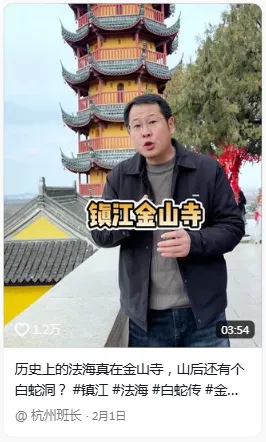 在“杭州班长”发布的视频里,他带着粉丝沉浸式漫游千年古刹,将江天禅寺的底蕴、金山寺的历史、法海洞的渊源以及白龙洞的传说,串联成一段生动的讲解。