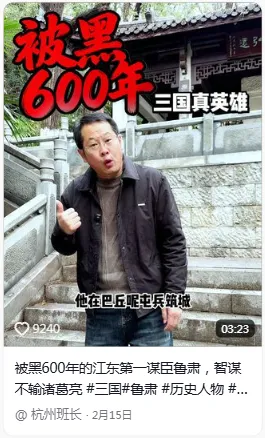 而在北固山鲁肃墓的视频中,“杭州班长”则为这位被《三国演义》低估六百余年的江东第一谋臣正名,堪称是东吴的“定海神针”。