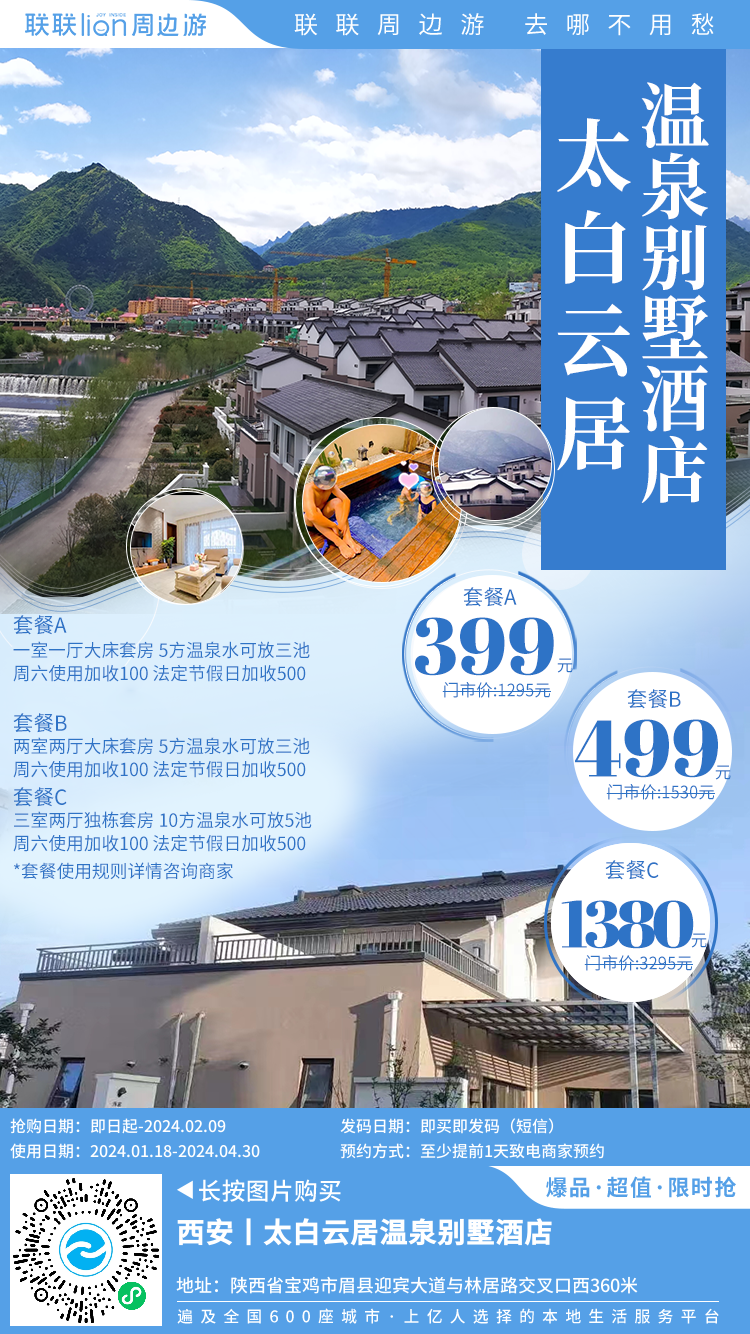 推荐3:太白云居温泉酒店避开人山人海,逃离快节奏!399元享一室星空房;499元享两室和家院;1380元享三室四季院,入户私汤池、早饭、烧烤,涮火锅,厨具齐全等应有尽有,点燃您对生活炙热的情怀~