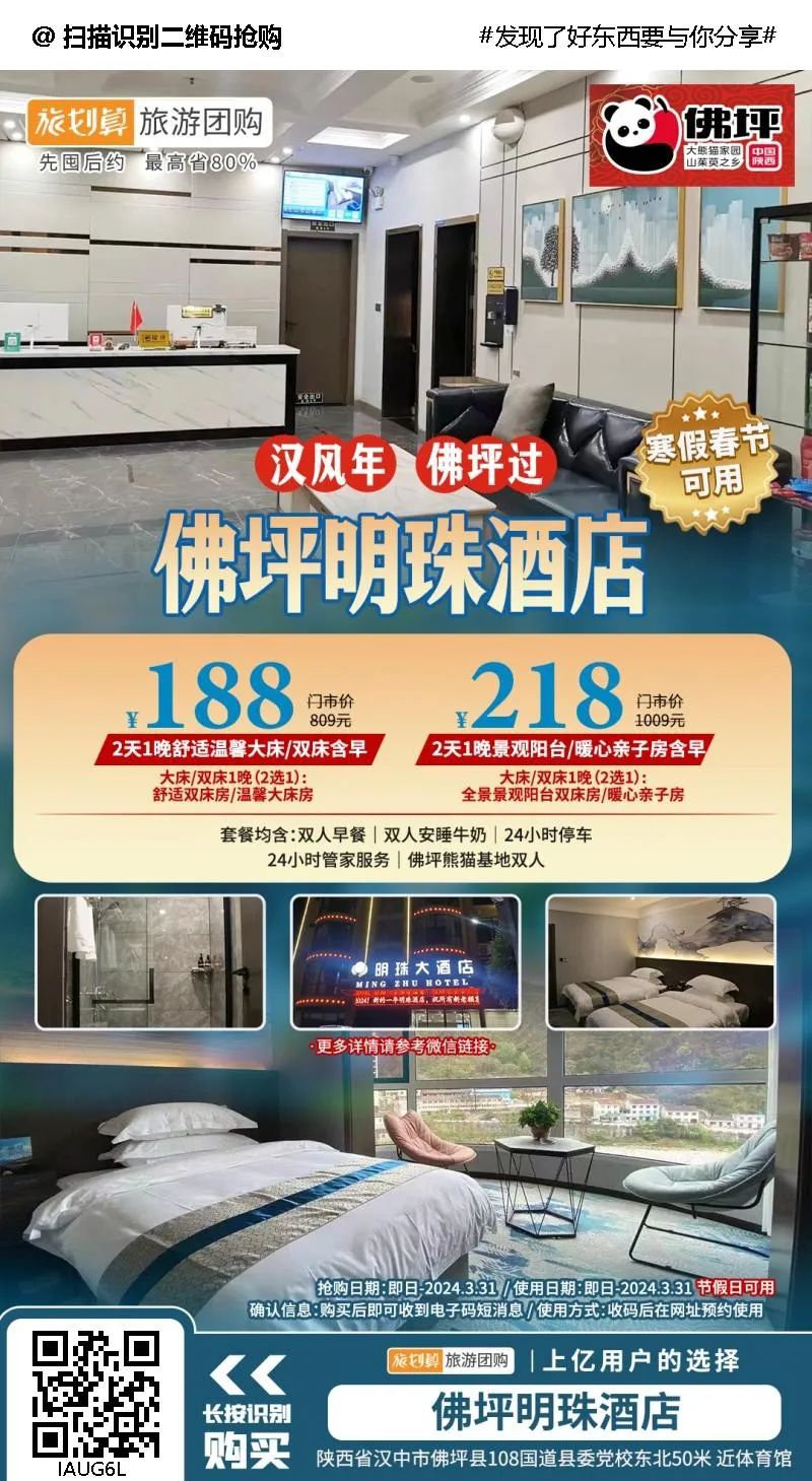 推荐1:【春节可用】【汉风年丨佛坪过】游佛坪!住性价比酒店!享大自然美景!¥188起抢价值809元「佛坪明珠大酒店」2天1晚舒适温馨大床/双床含早!