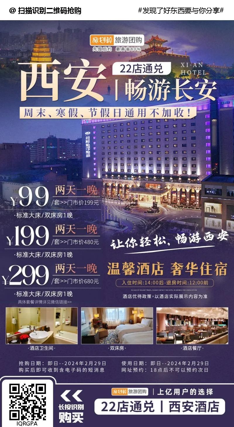推荐2:【春节可用】【通用不加收丨畅游长安 西安酒店22店通兑】经济&舒适&高档型酒店2天1晚住宿99元起~!