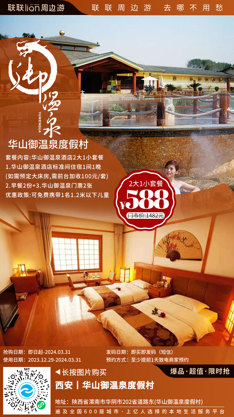 推荐14:【华山御温泉度假村】588元享【华山御温泉度假区两大一小套餐】华山御温泉度假区标准间住宿1间1晚+早餐2份+华山御温泉门票2张