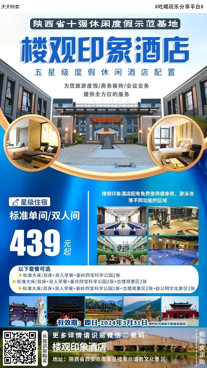 推荐6:周至楼观印象酒店【标准大床/双床】+双人早餐+秦岭四宝科学公园2张
